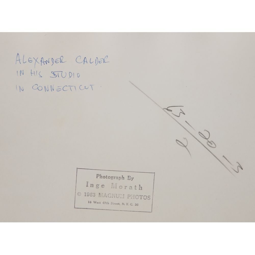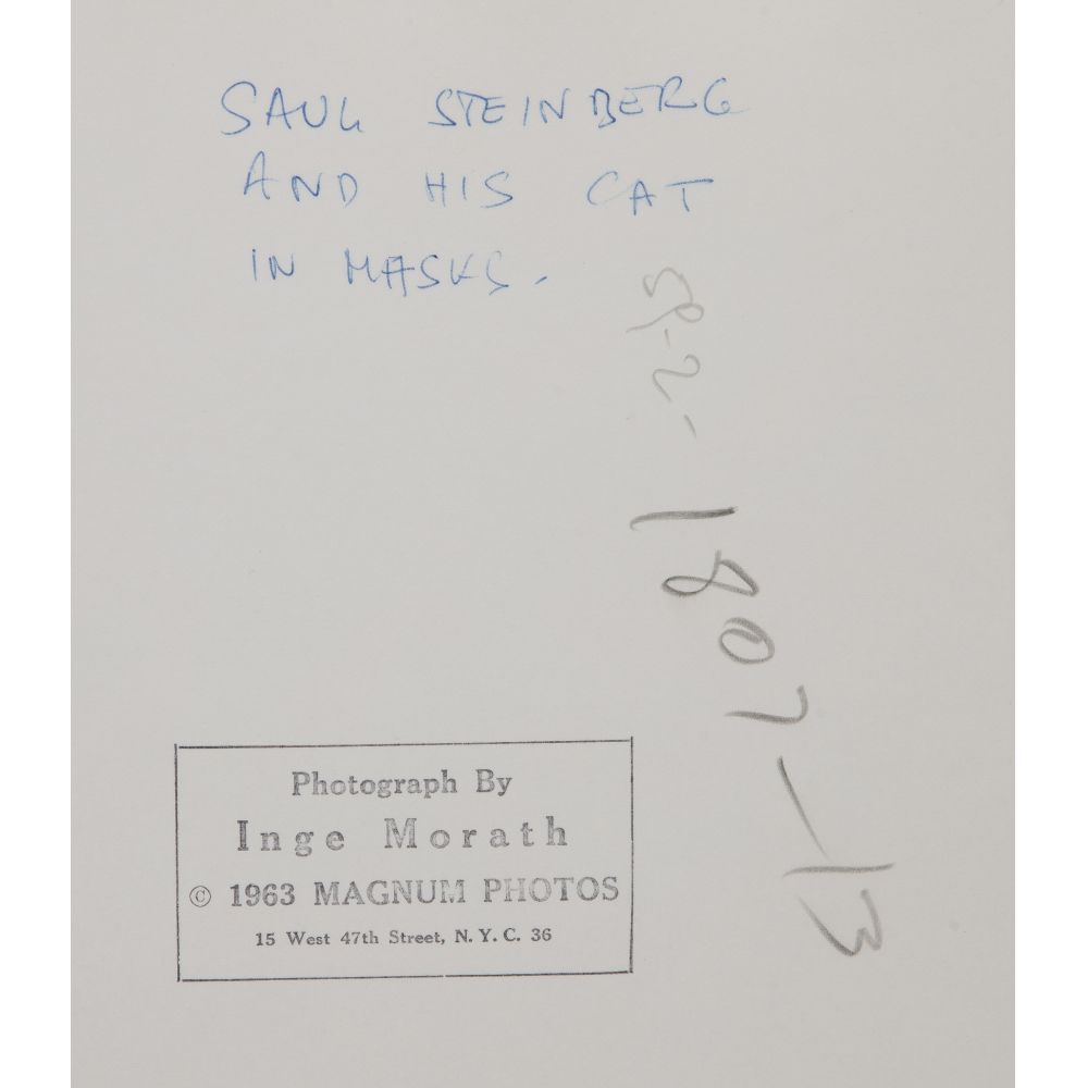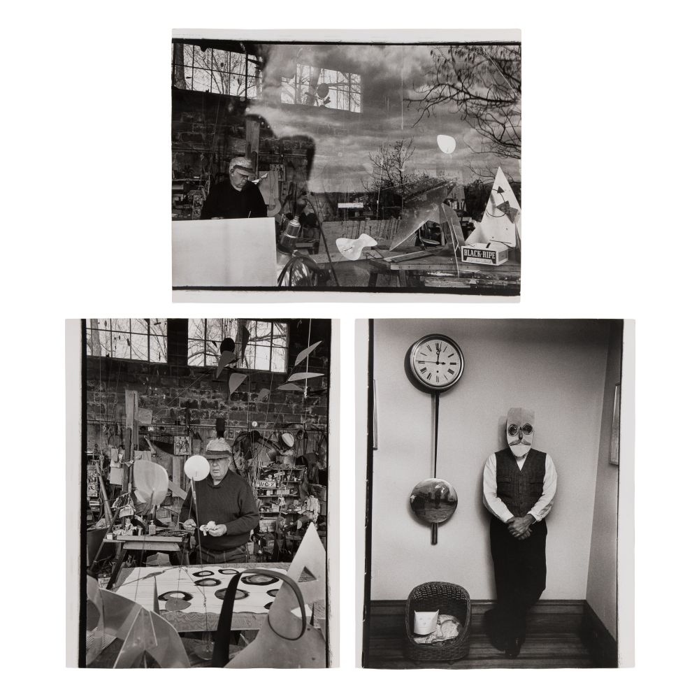 (3) 1963 photographs including a Saul Steinberg with cat and (2) of Alexander Calder in his Connecticut studio, stamped, dated and having annotations verso