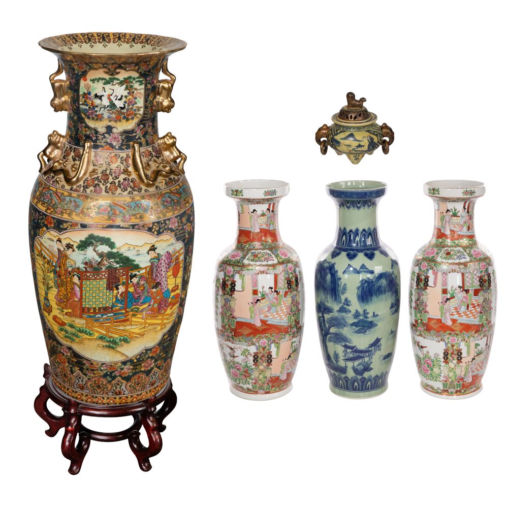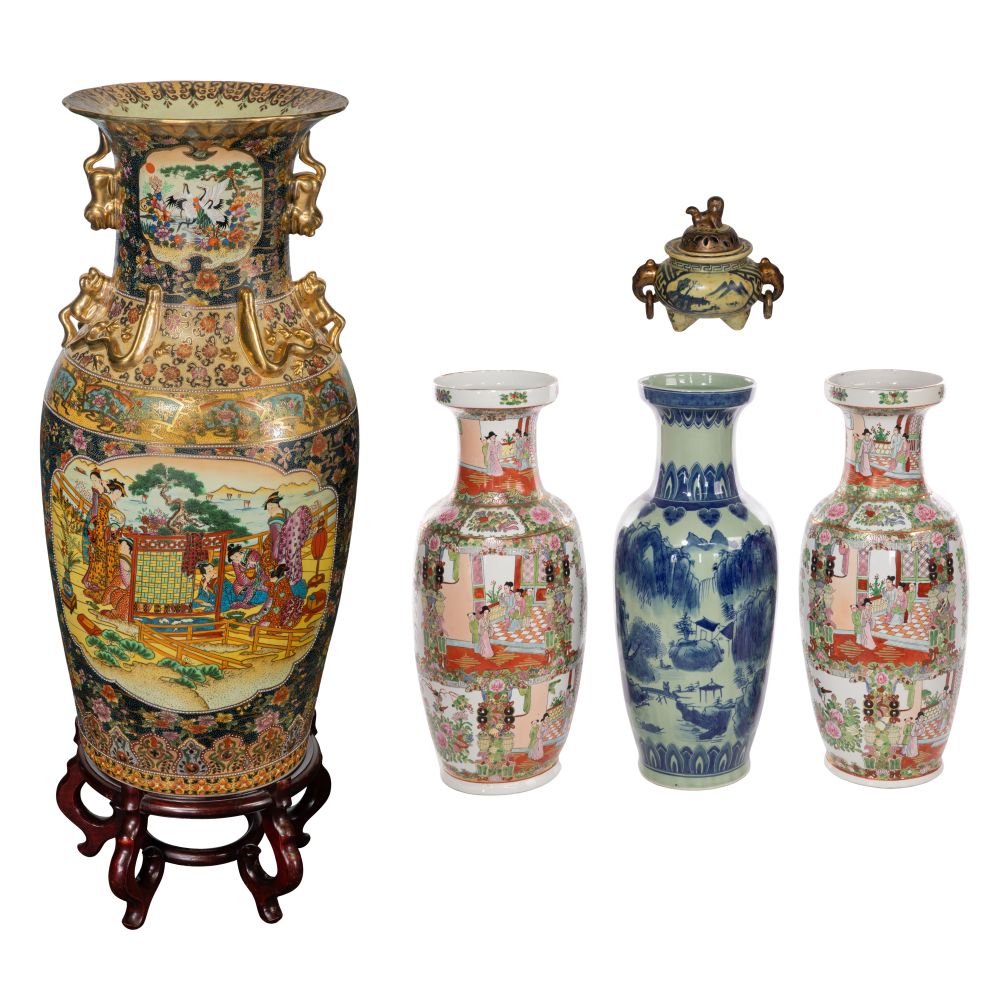 (5) total items including a Japanese Satsuma floor vase having gilt handles, applied dragons and moriage on a wood stand, an underglaze blue and white Japanese vase, both having marks underside as well as (2) matching unmarked Chinese famille rose vases; together with a Japanese blue and white lidded censer having bronze-tone gilt foo lion lid and elephant handles having suspended rings, marked underside