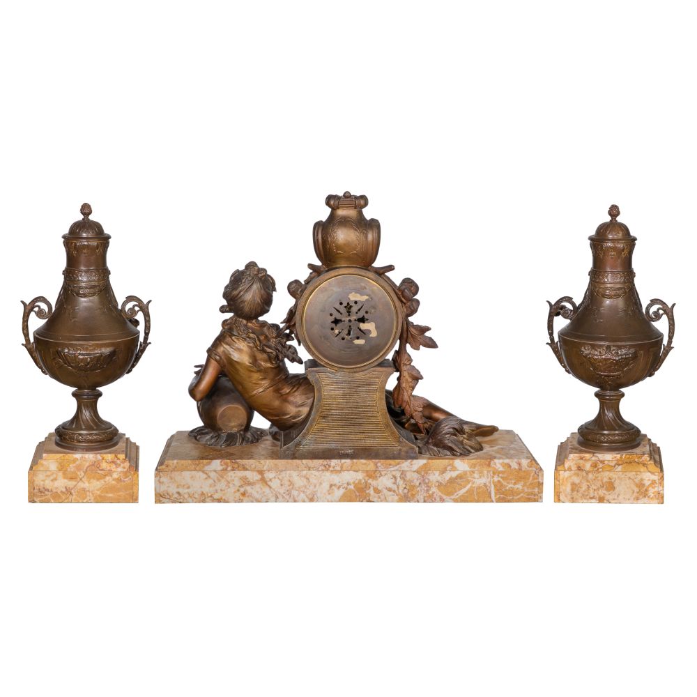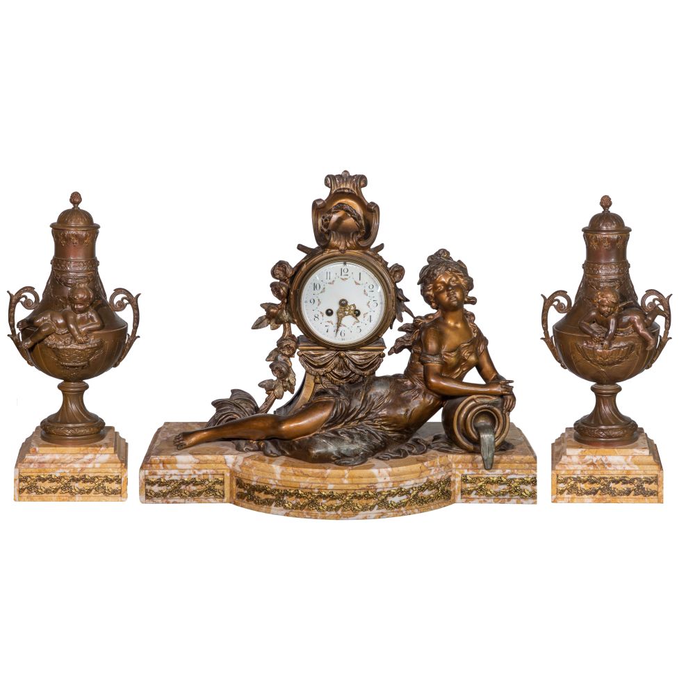 3-piece set including a figural clock signed L & F Moreau having a reclining woman leaning on a jug spewing water, white enamel face set on a marble plinth having floral accents, no key and matching cherub accented urn garnitures set on marble plinths