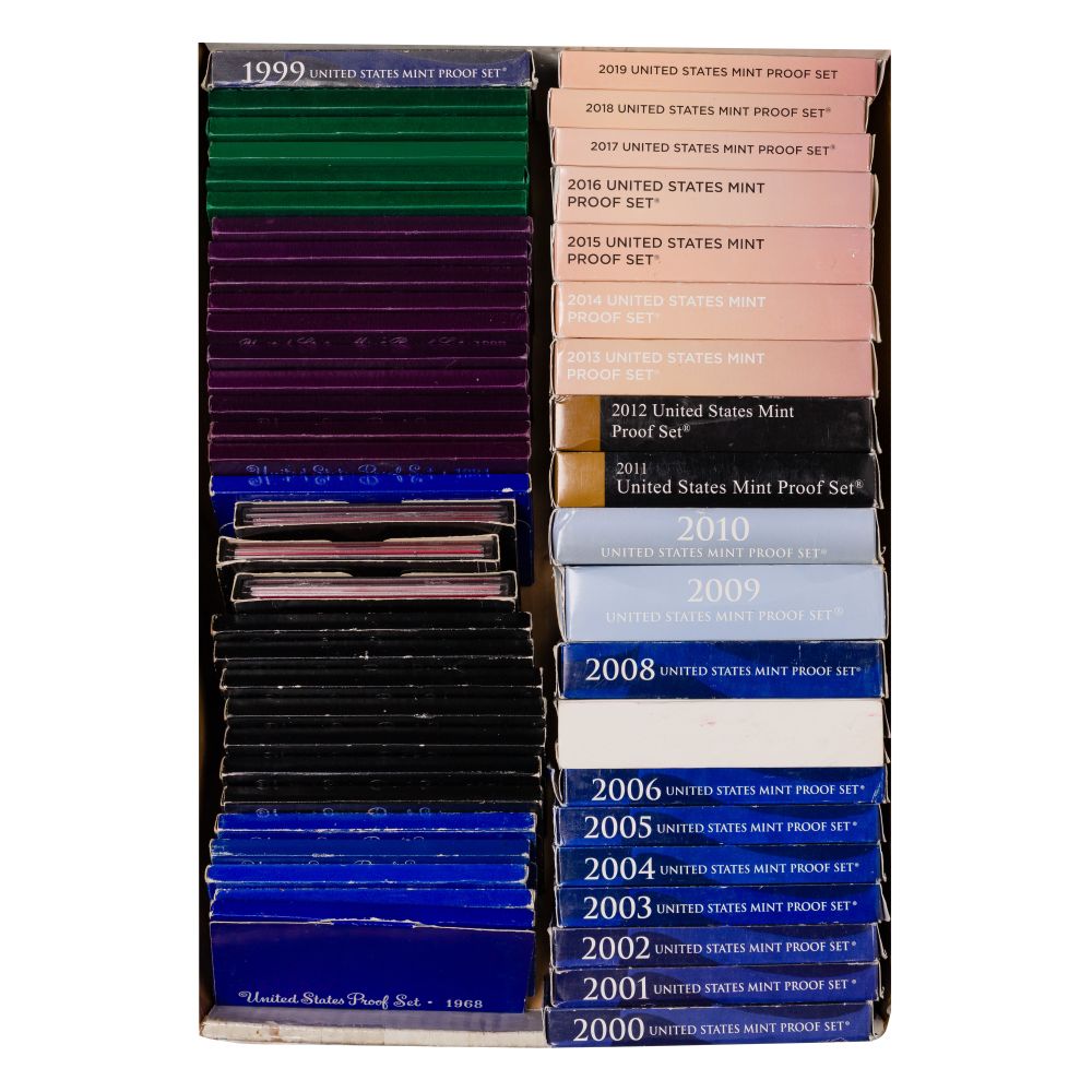 Including proof sets from 1955 through 1964 in original envelopes and boxed sets from 1965 through 2019; together with PMG graded foreign currency and (6) bronze tokens