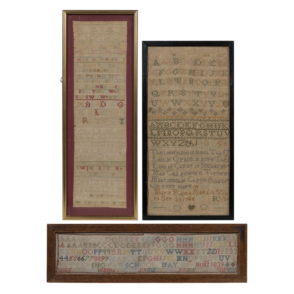 (3) items including a dated “Oct. 19 1705” work by Hester Webb crediting “Anne Brewster Governess”, float mounted on backing, a work by “Mary Reed Aged 13 Years” dated “Sep. 29 1788”, both having alphabets, numerals and devotional verses, as well as an anonymous work having stitched “Kettering School 1889 Built 1839” having alphabets and numerals above a Greek key within a linear border, all behind glass in wood frames