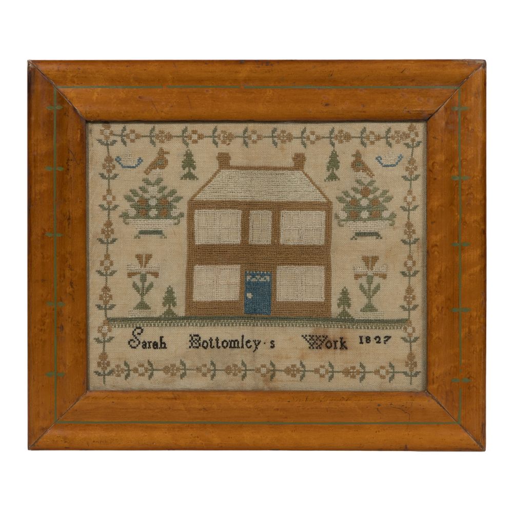 Having birds, trees, flower baskets and flowers surrounding a house, above the stitched inscription “Sarah Bottomley’s Work 1827”, all within a floral border, behind glass in a wood frame