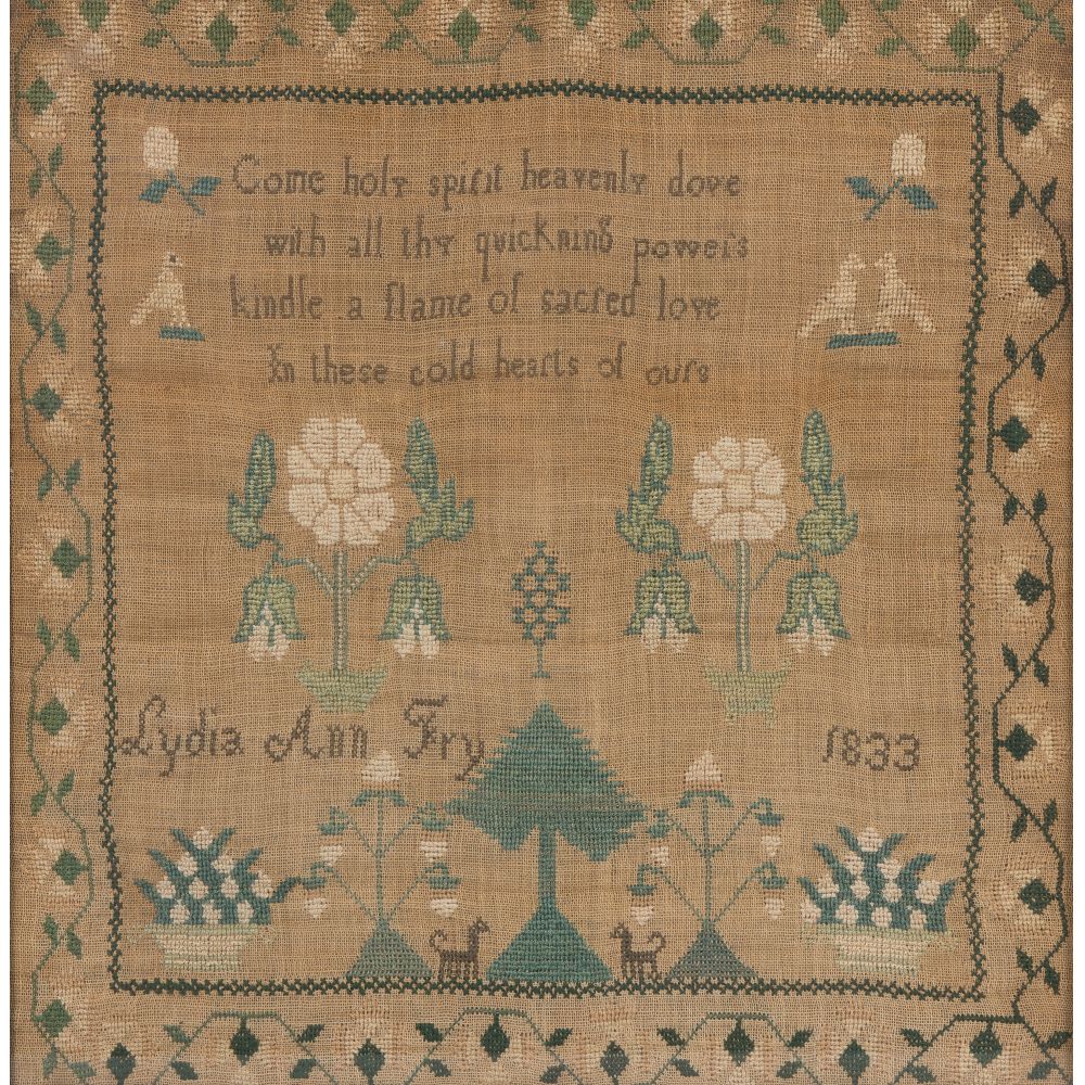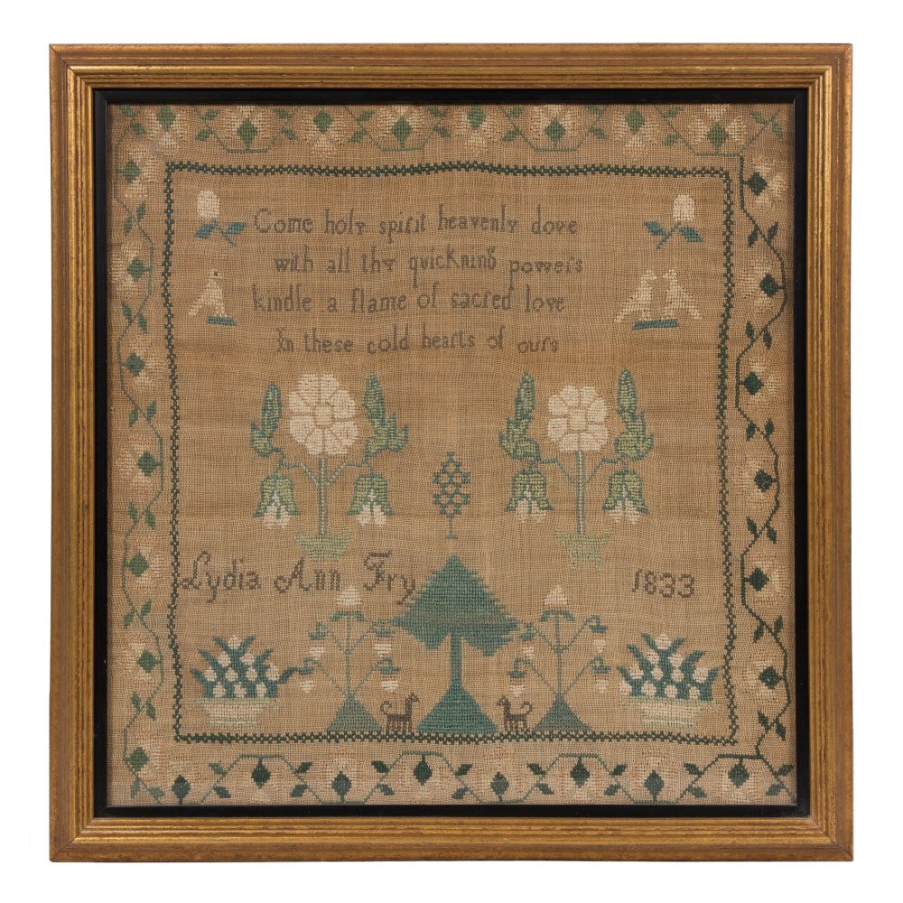 Having a stitched devotional poem surrounded by flowers and birds above the inscription “Lydia Ann Fry 1833 ” above a central tree flanked by dogs, flowers and flower baskets, all within a floral scroll border, behind glass in a gold-tone wood frame