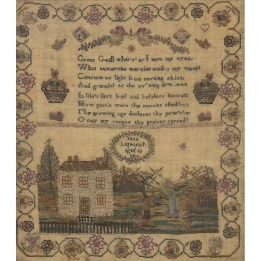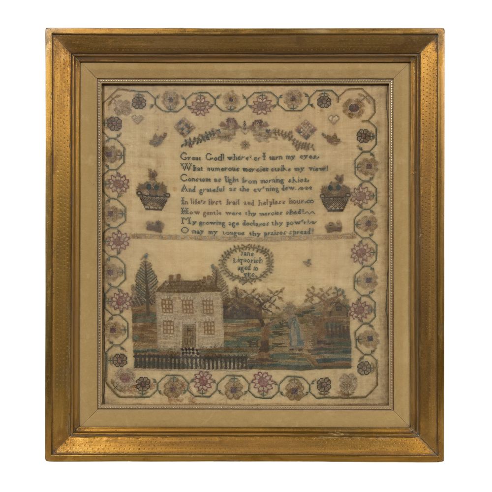 Having stitched inscription “Jane Liquorish Aged 10 Years” within wreath below a devotional poem and above the depiction of figures in the fenced yard of a house, all within a floral scroll border, behind glass in a gold-tone wood frame