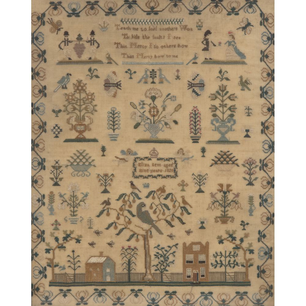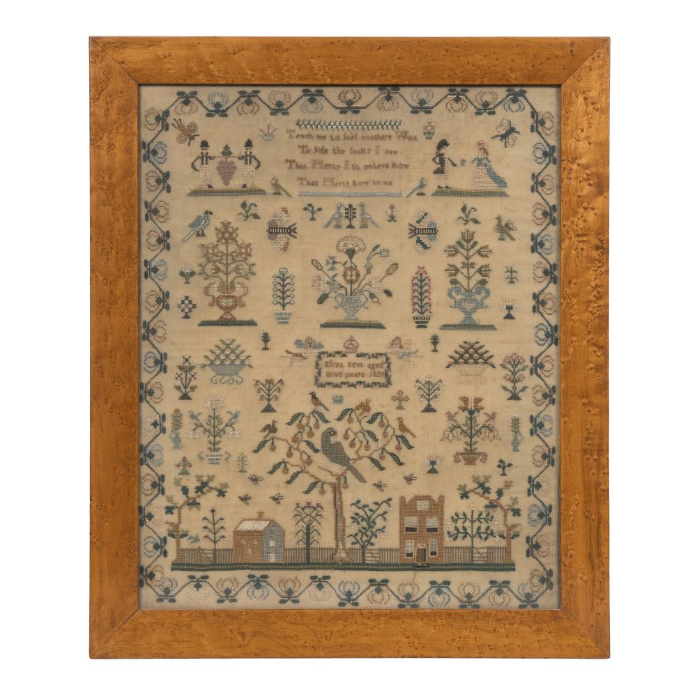 Having a stitched devotional poem flanked by pairs of figures, above a row of flower vases, above the inscription “Eliza Bent aged nine years 1820” within a crown-topped wreath flanked by flower baskets, above a depiction of a bird-filled tree flanked by buildings having fenced yards, a profusion of insects, birds and flowers filling the gaps between larger elements, all within a floral scroll border, behind glass in a wood frame