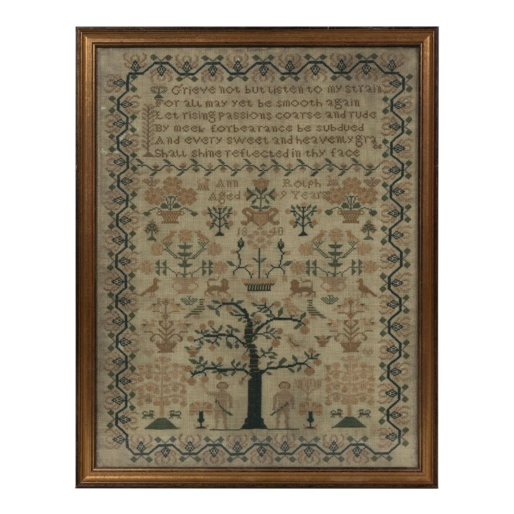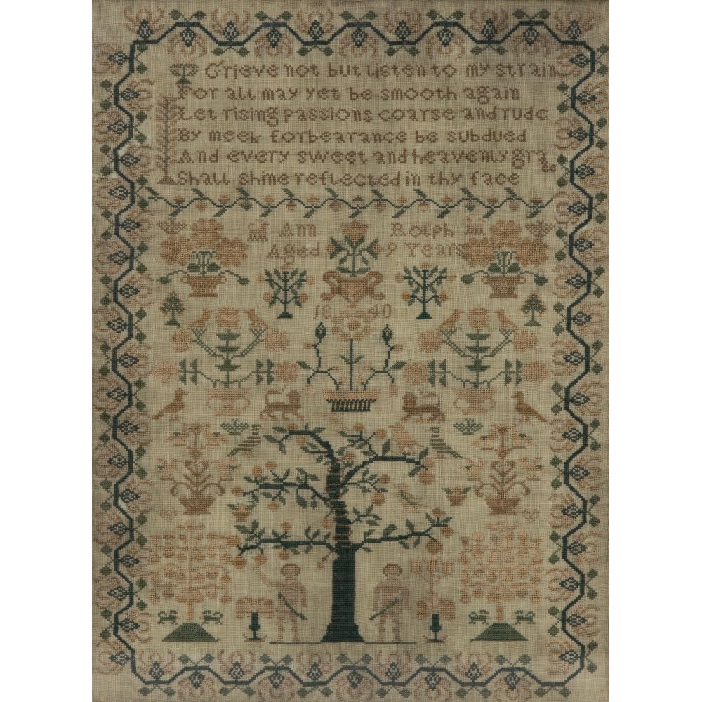 Having a stitched devotional poem above the inscription “Ann Rolf Aged 9 Years” and “1840”, a depiction of Adam and Eve beneath the apple tree, the Serpent coiled around it and holding an apple in its mouth, amid a field of flower baskets, trees, birds, butterflies and lions, all within a floral border, behind glass in a gold-tone wood frame