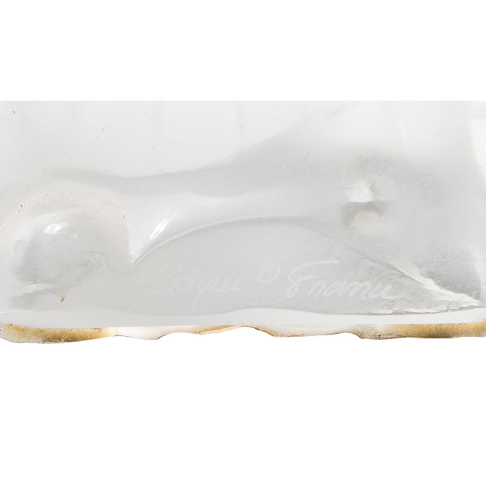 A pair of dragon sculptures in clear and frosted finish, sitting in a serpentine position, signed, one retaining original label