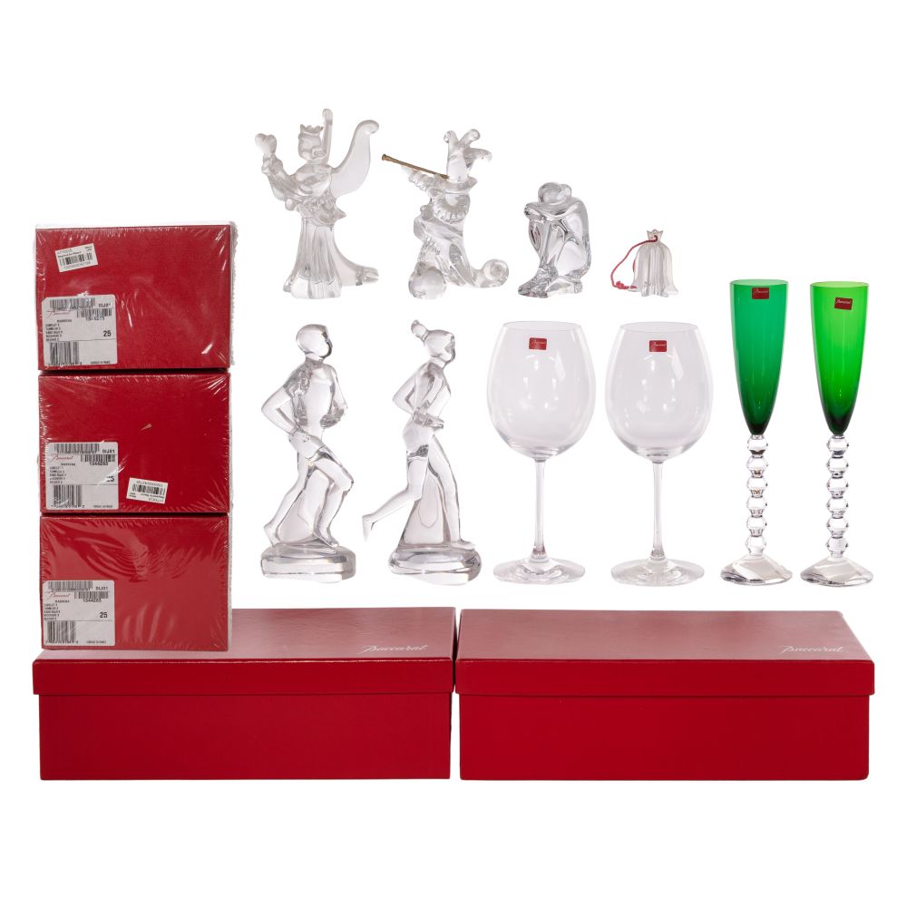 (13) items including (2) green bodied flutes each having original box and inserts, (3) tumblers sealed in original boxes, (5) figurines, (2) goblets and a Christmas ornament, some retaining original labels