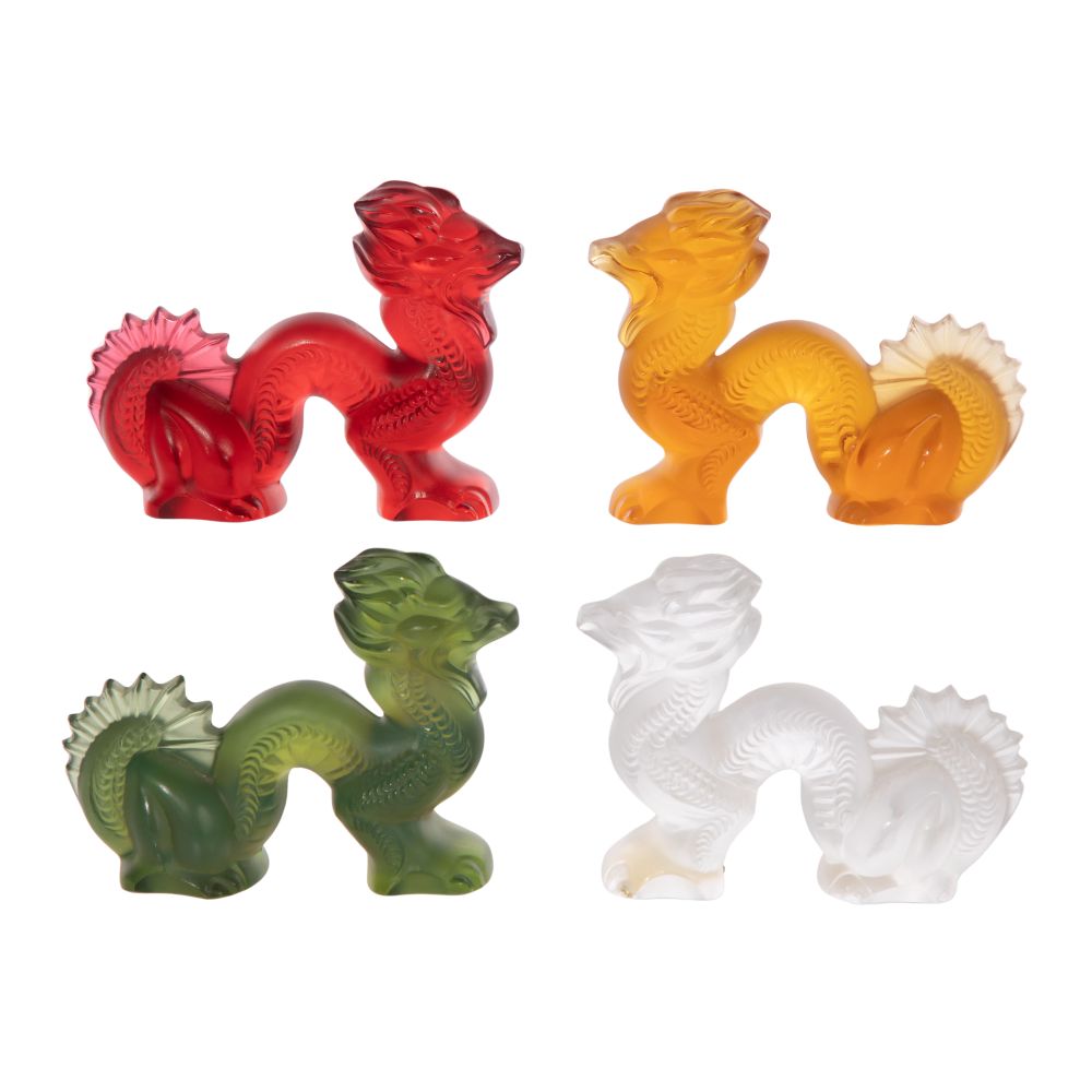 A set of four dragon figures in amber, clear, green and red, all etch marked on underside