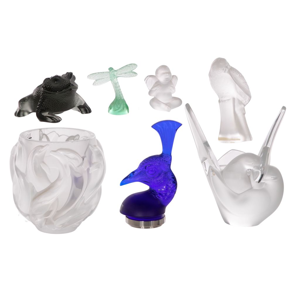 (7) items including a Sylvie vase with flower frog, a Dolphin Oceanian vase, a Peacock Head car mascot, a Gregoire toad, a Malizloso cherub, a green dragonfly paperweight and a Parakeet, all signed, some retaining original labels