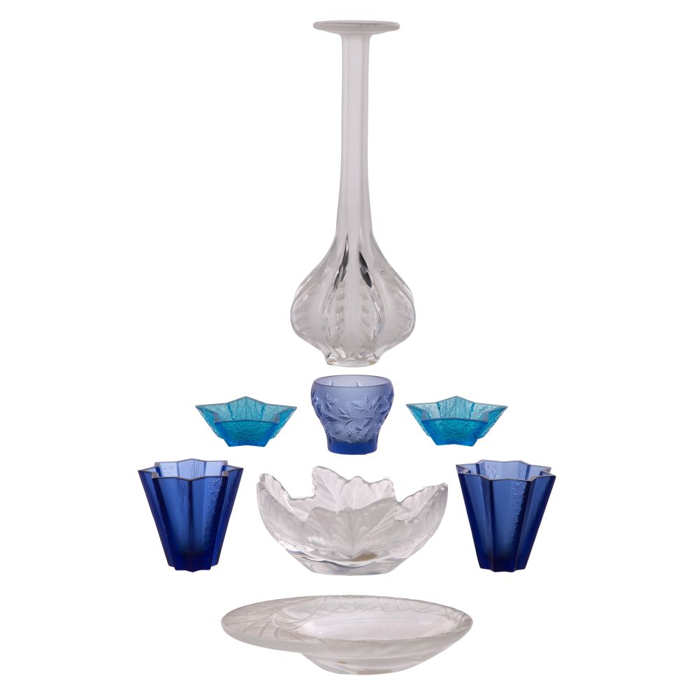 (8) items including a Claude vase, a Romarin votive holder, (2) Vega sapphire bowls, (2) Stella sapphire vases, a Compiegne bowl and an Art Nouveau style oval asymmetrical bowl, all etch signed