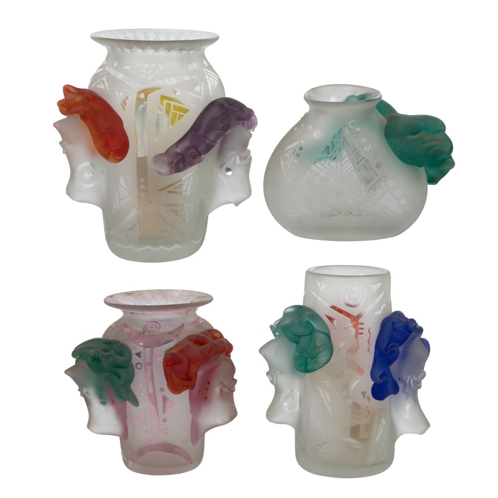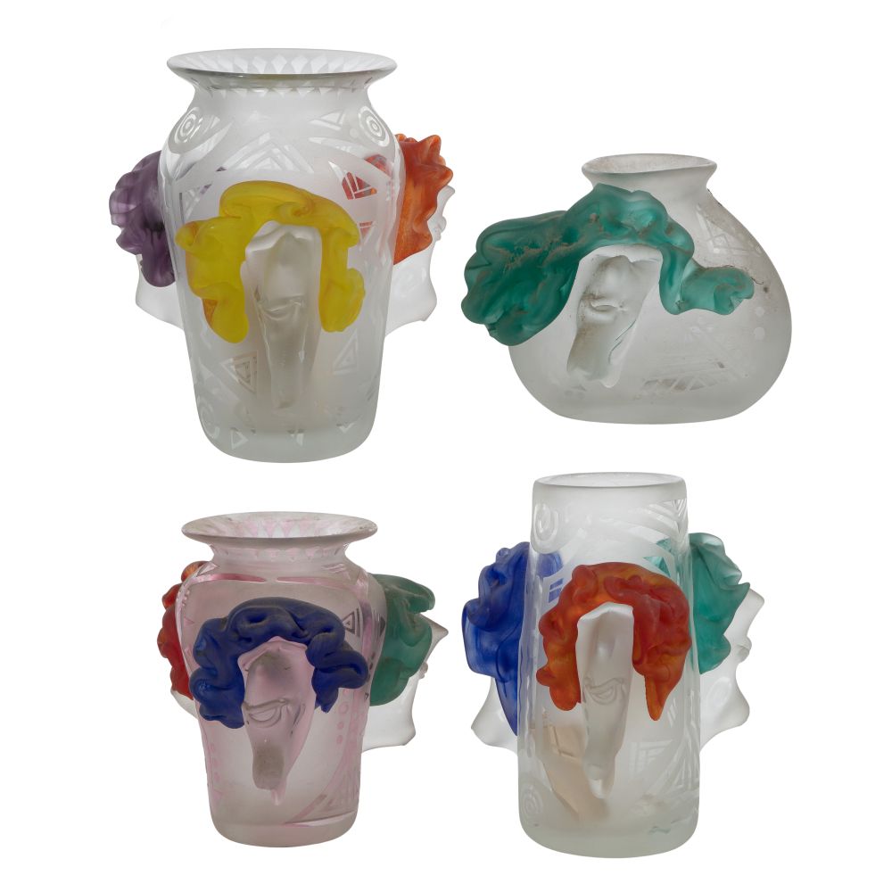 (4) vases in various sizes having etched patterns, applied heads with abstract faces and various colored hair, all signed and dated on undersides