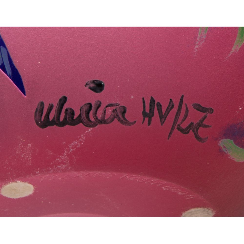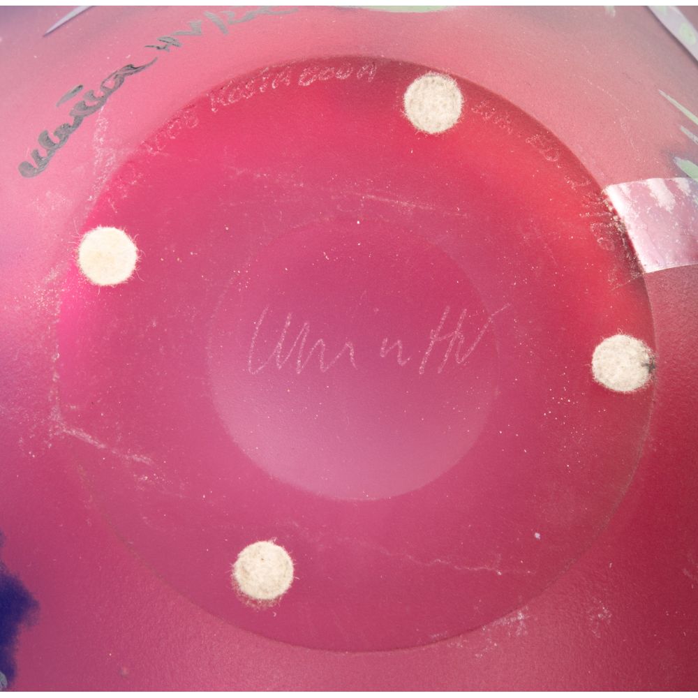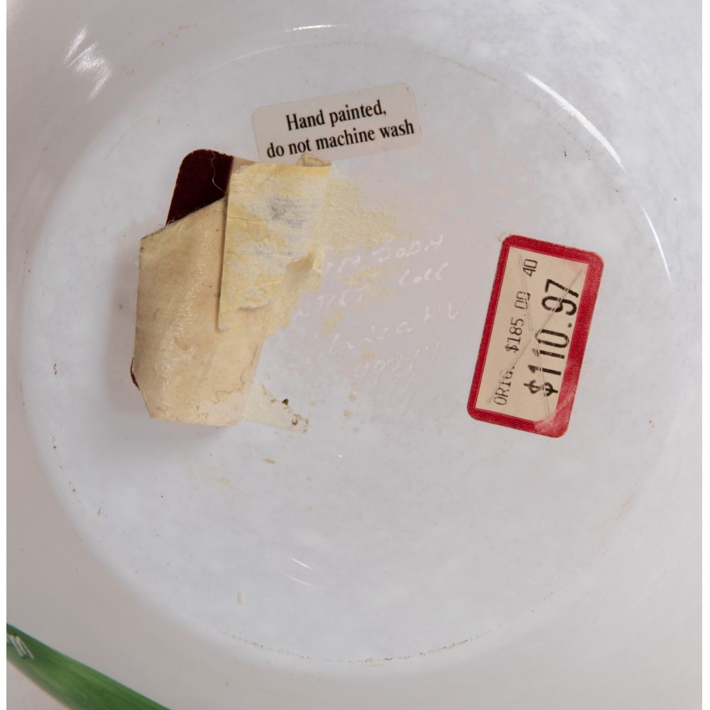 (3) items, all hand painted and signed, including a tulip vase and (2) jewel colored, hand painted bowls, retaining original sales labels on underside