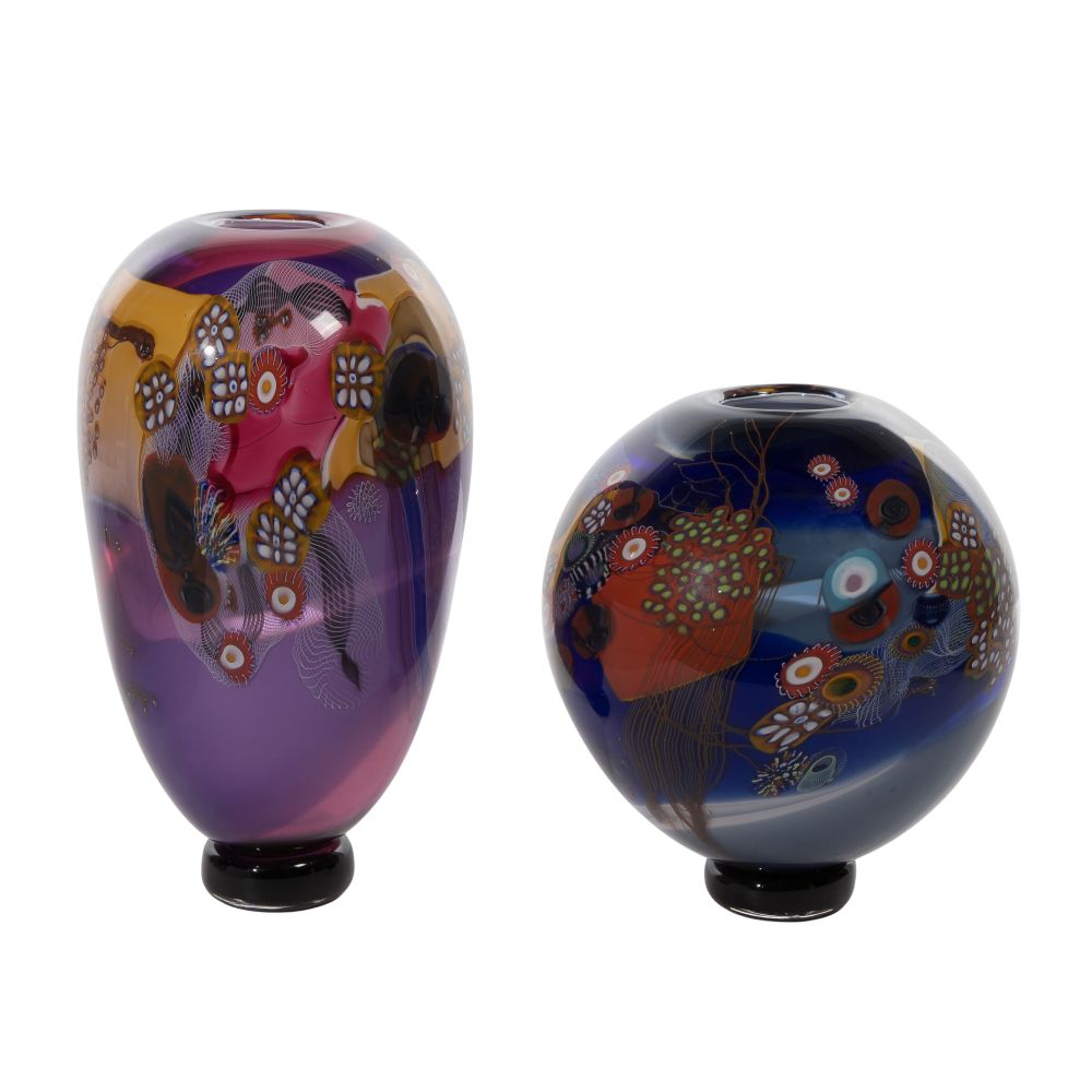 (2) undated, signed hand blown art glass vases, including a taller ovoid and a round, both having millefiori design
