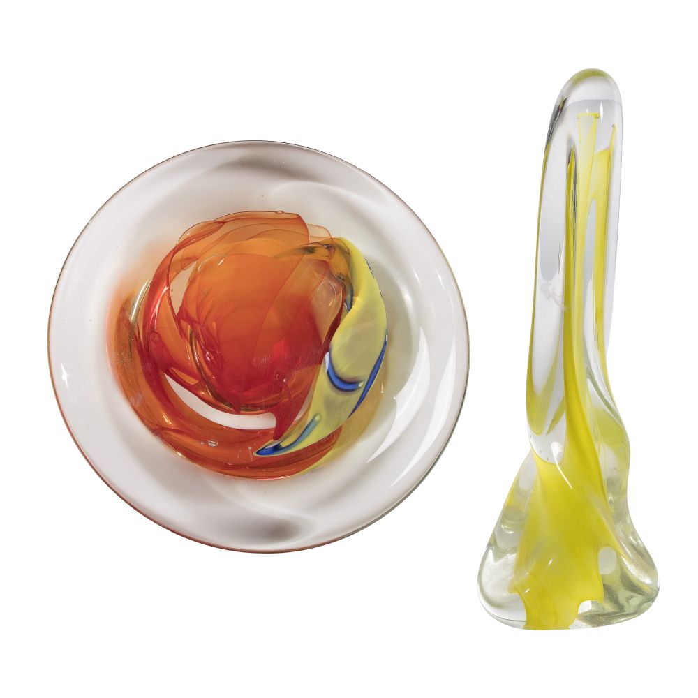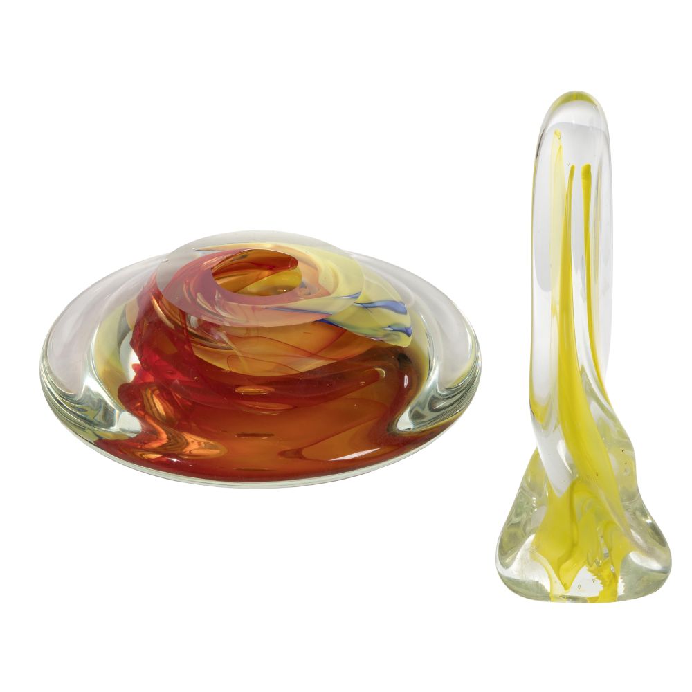 (2) signed items including a 2006 free-form elongated sculpture having a yellow interior and a 2013 disc having a yellow, orange and blue center with hole on back for hanging