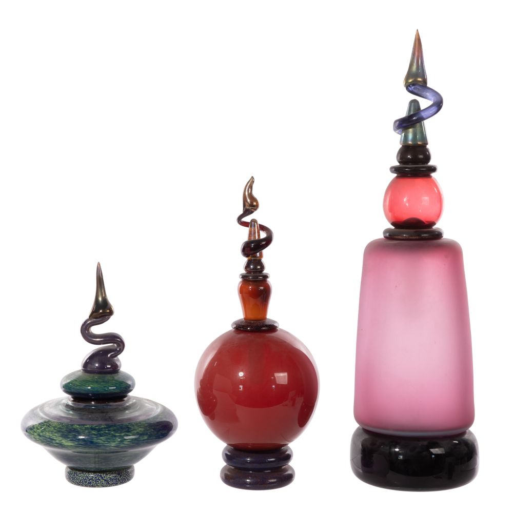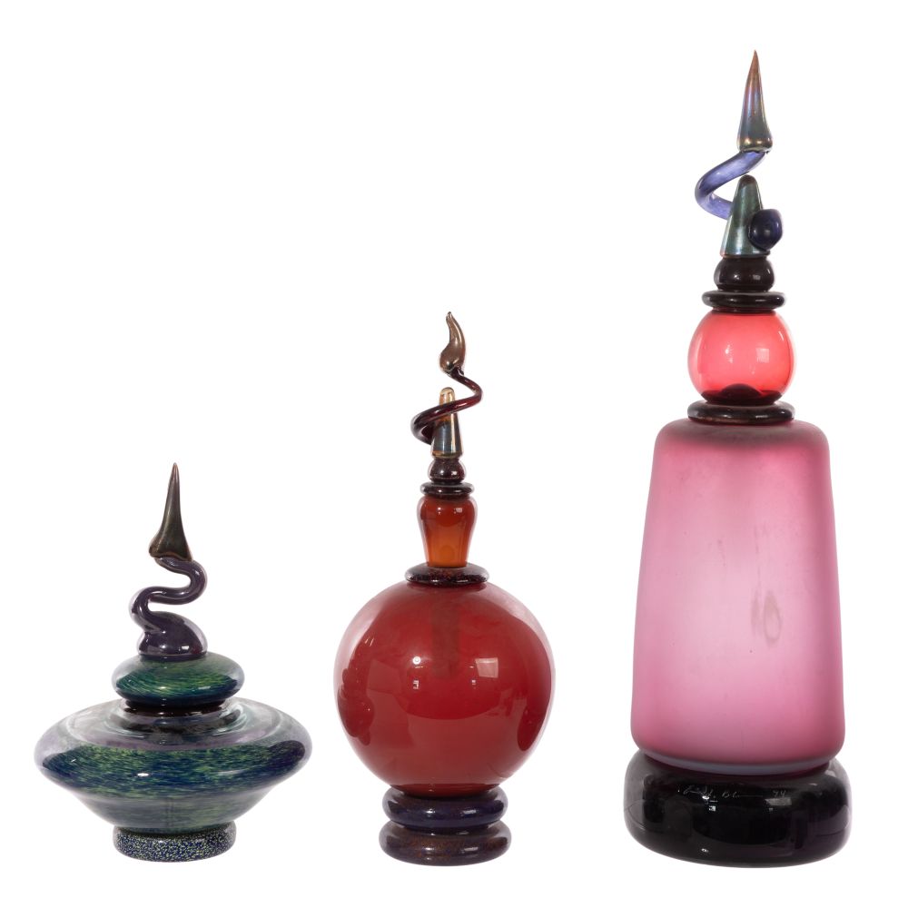 (3) items, all hand blown bottles having spiral form stoppers of various colors, the tallest and shortest having engraved signatures, dated “’99” and “’95” respectively