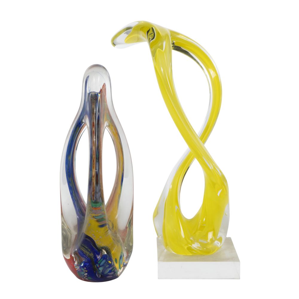 (2) total items, including a 2001 Karg free-form glass sculpture having a center space creating three elongated sides, signed; together with an unsigned free-form glass sculpture having a yellow center on an acrylic base
