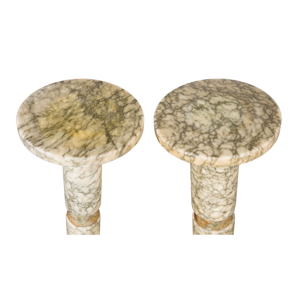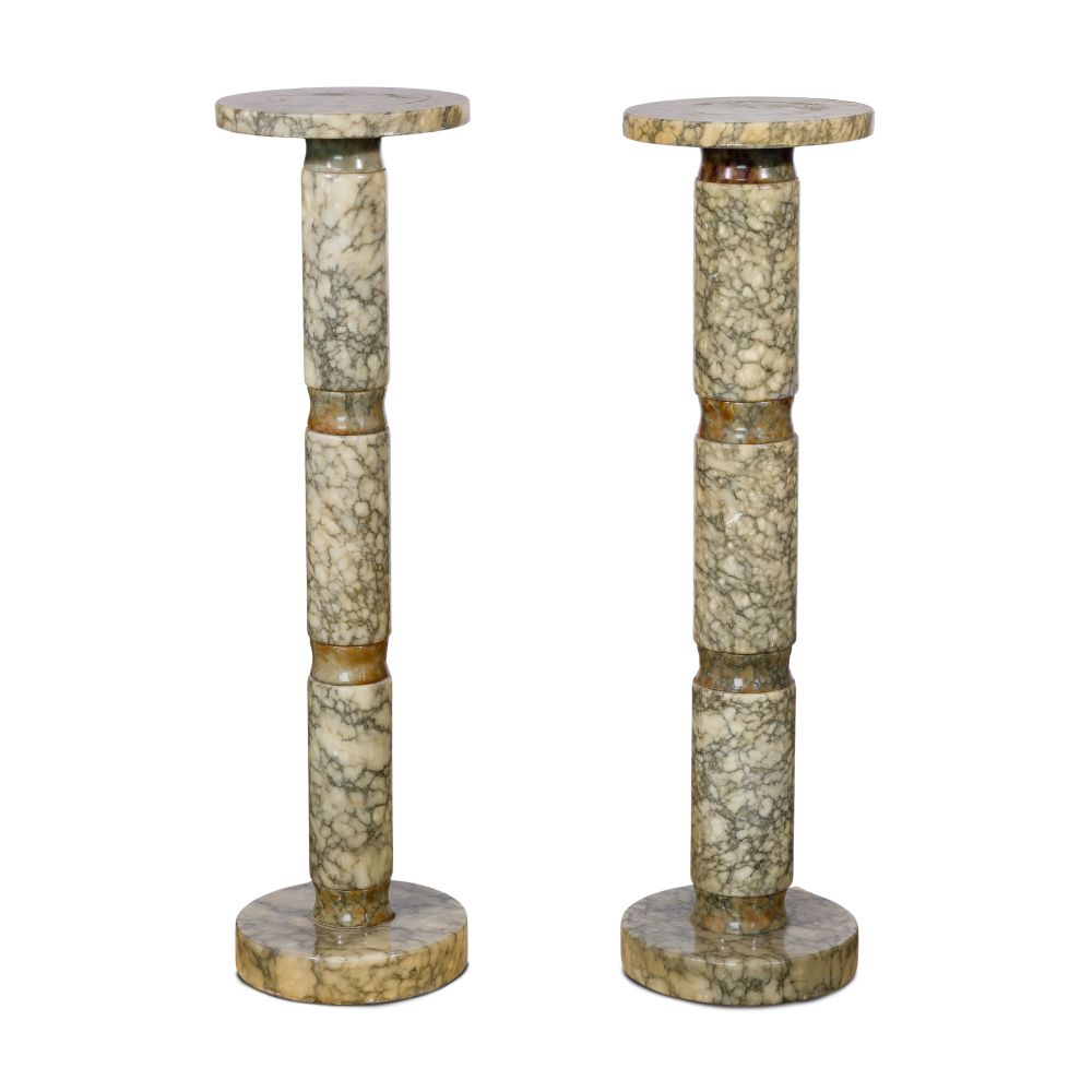 A pair of columns having decorative bands, assembled from sections joined by threaded rods