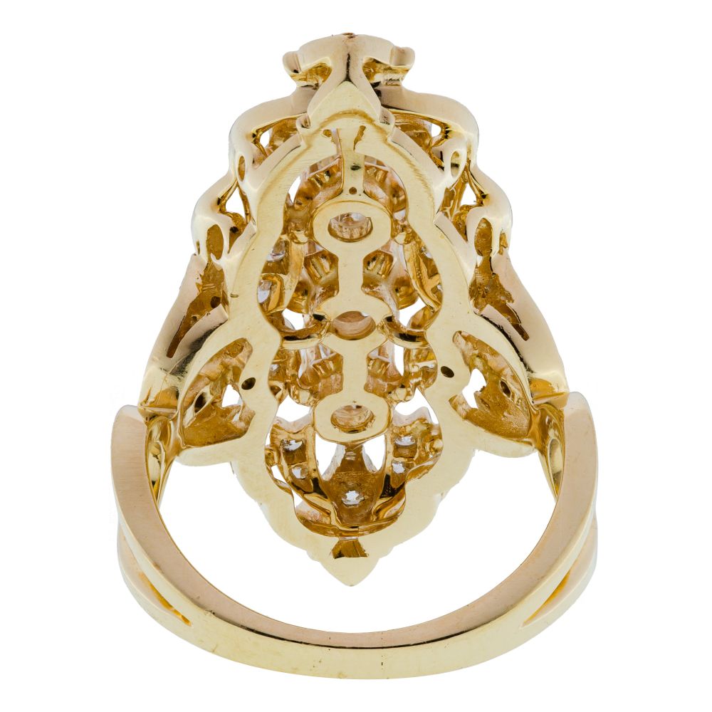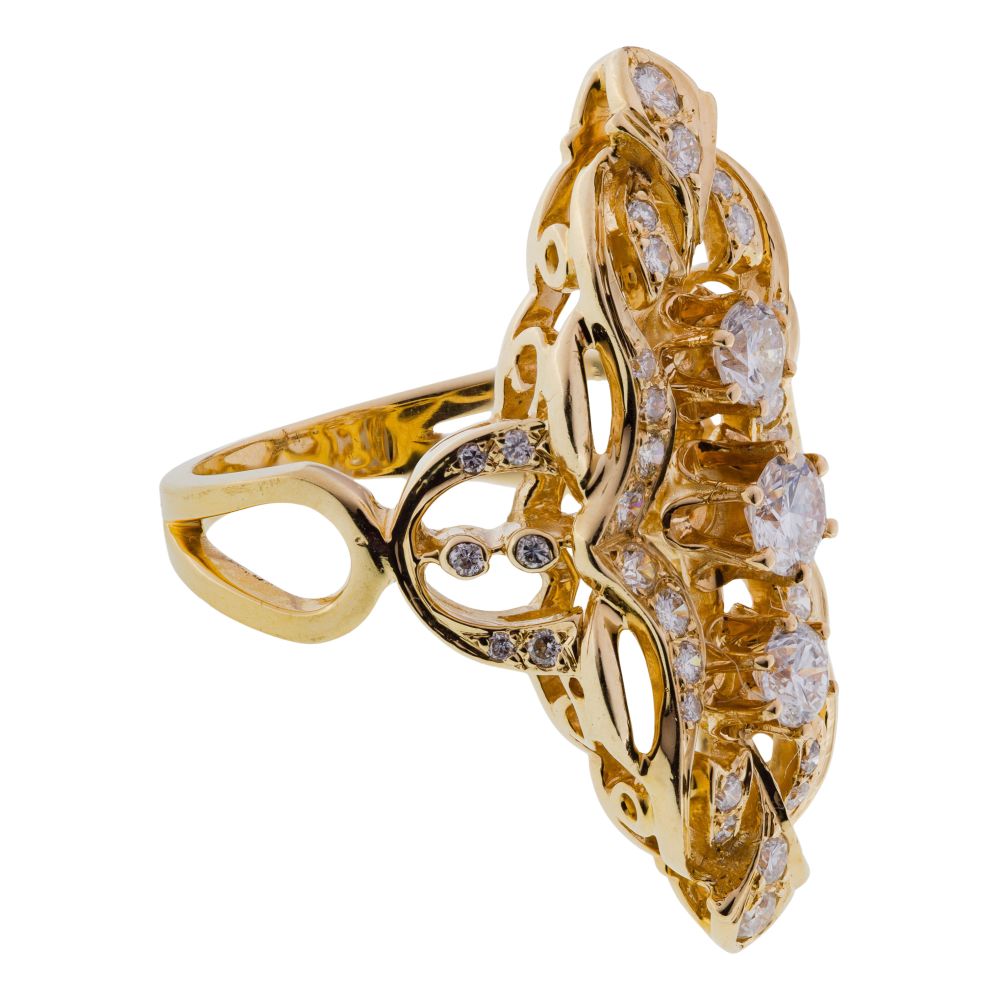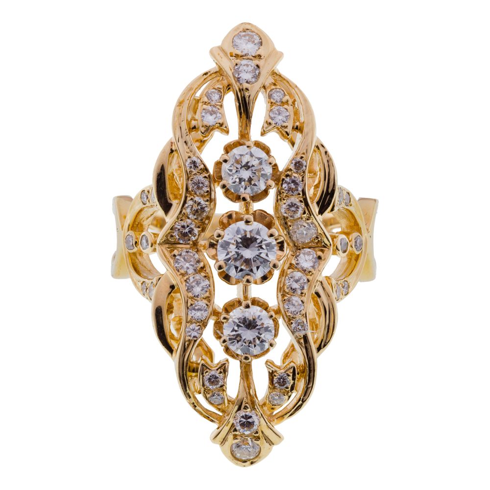 A navette style ring having a center of three round cut diamonds, surrounded by accent diamonds in swirl form (marked “14k”)