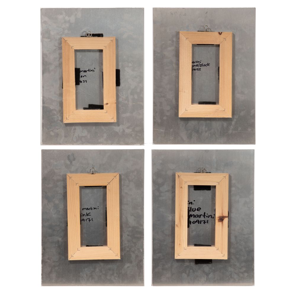 Undated, each signed, a suite of four panels depicting martini glasses in blue, pink, green and black, notations to verso, mounted to wood stretchers