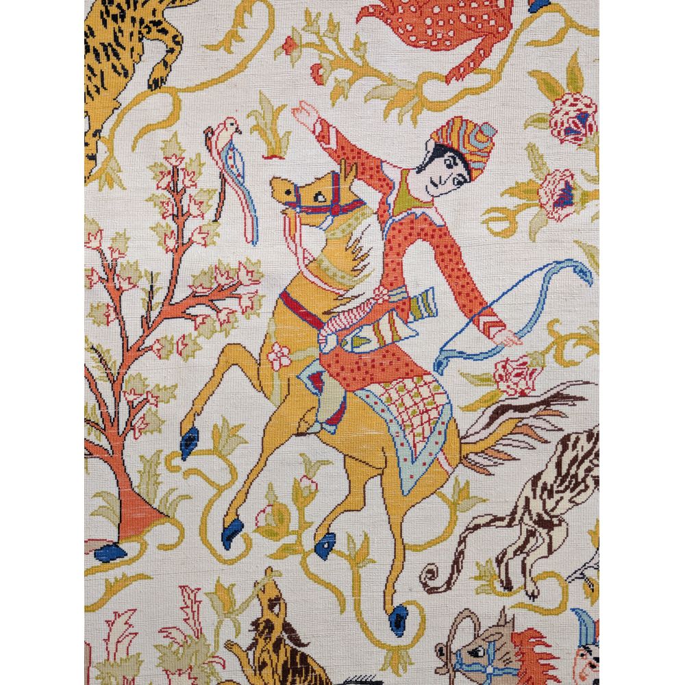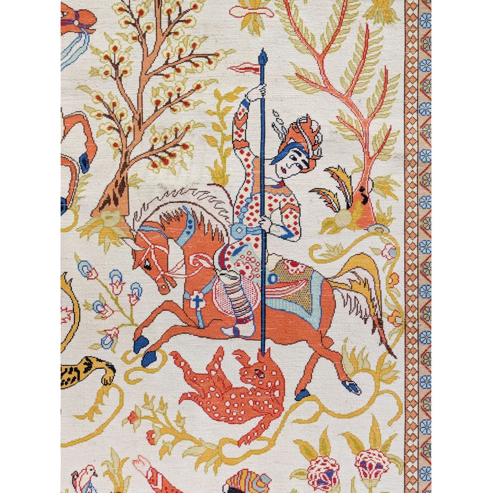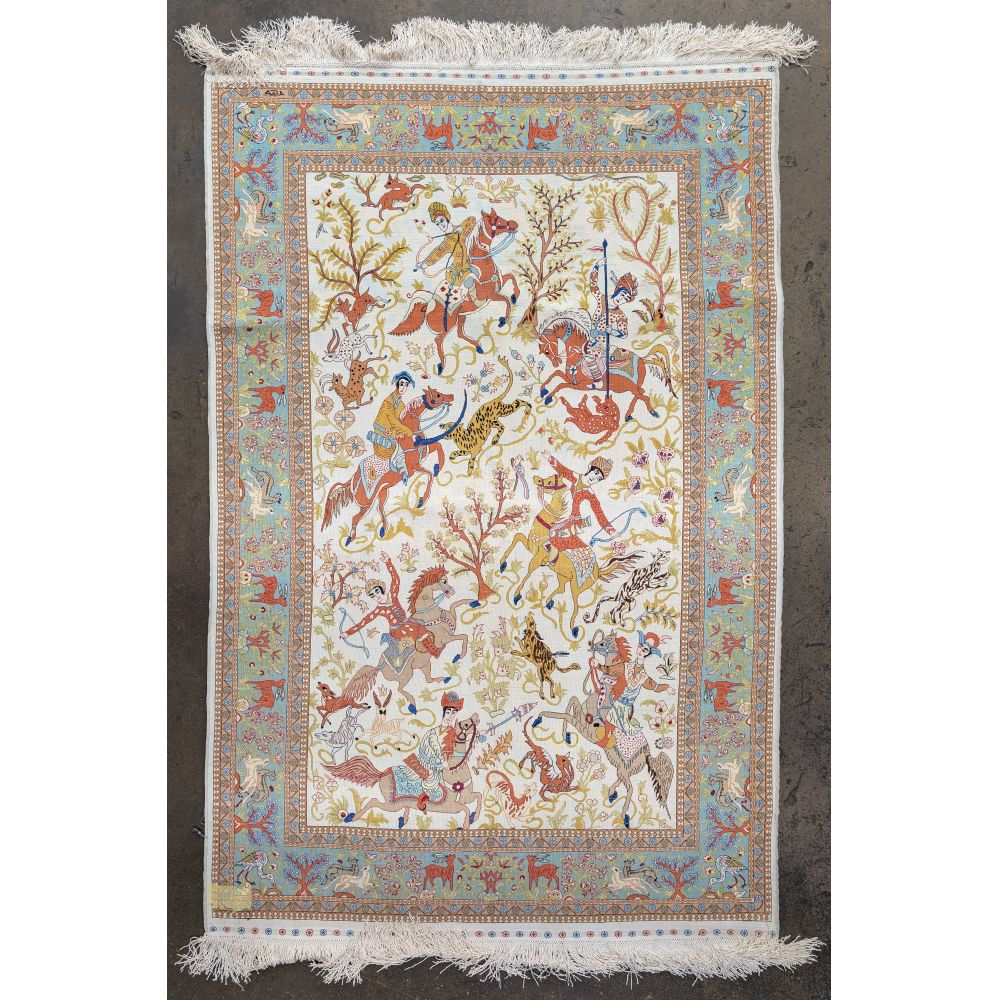 Silk on silk carpet having a multi-color Ottoman hunt scene on pale yellow ground within a border having animals, trees, flowers and geometric bands on a green ground, a lead bulla type export seal on a wire piercing a side selvage and retaining a COA (stating approximate knot count at 645 per square inch), sales contract and business card from Gallery Anatolia, Nevsehir, Turkey