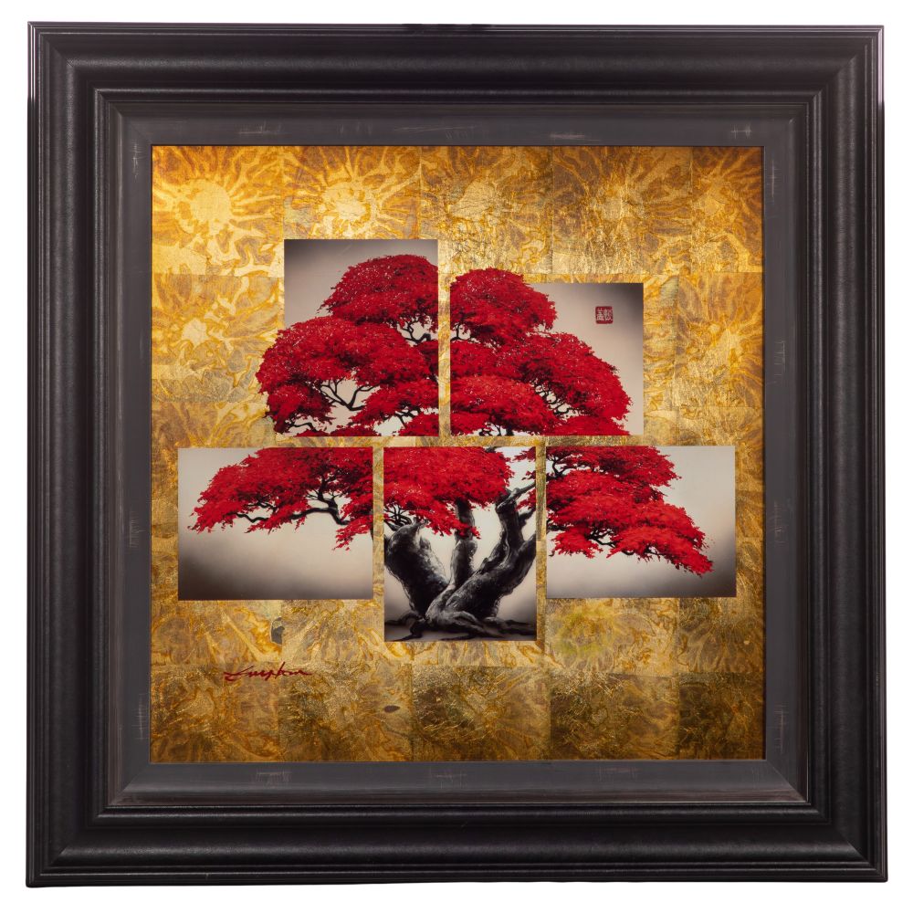 Undated, signed and artist chop mark, having an opaque red Bonzi lacquer layered over a foundation of gold leaf, in a black leather covered wood frame, having cut out for title and artist label verso
