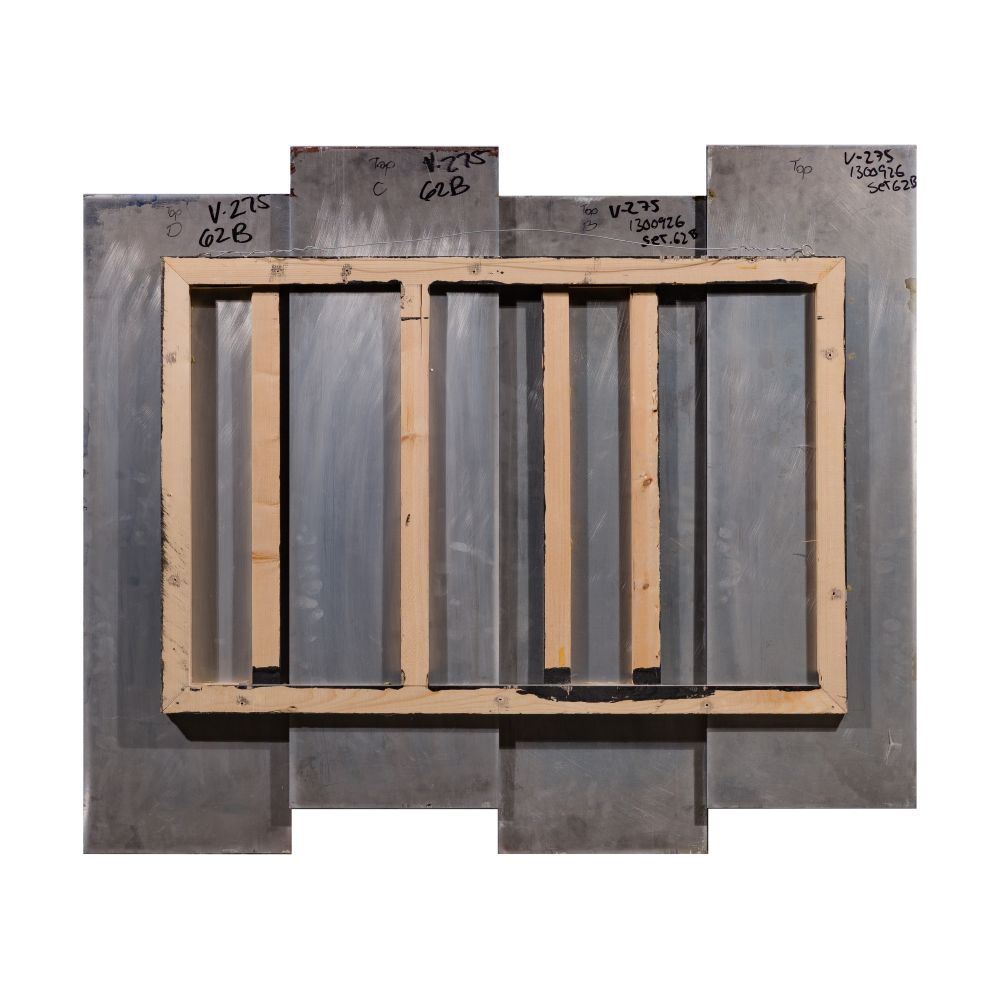 Undated, signed lower right, abstract on metal panels assembled on a wood support