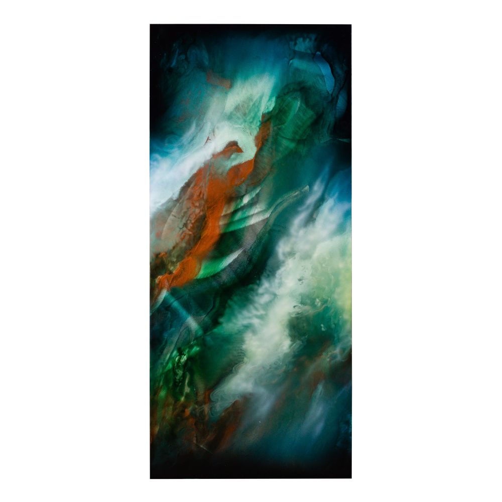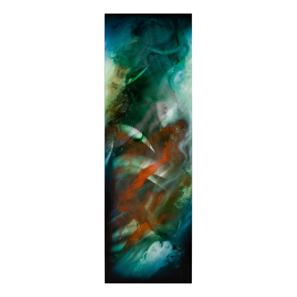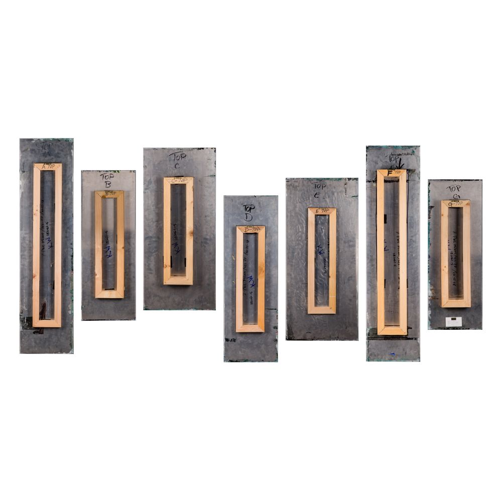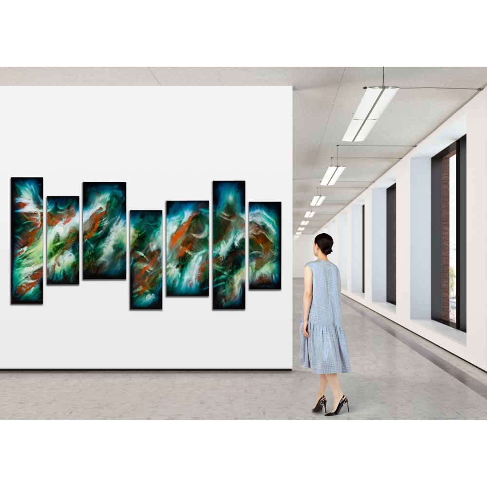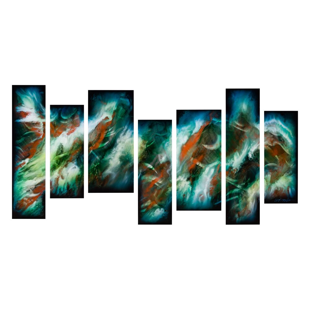 Unsigned and undated, 7-panel set, each having artist notations verso including title and lettered “A” through “G” for placement, forming an abstract composition on metal panels mounted to wood stretchers