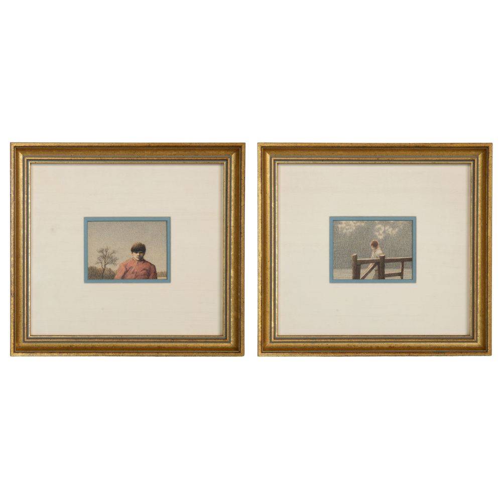 (2) 1971 depictions of young men in various backgrounds, signed, matted under acrylic in gold-tone painted wood frames