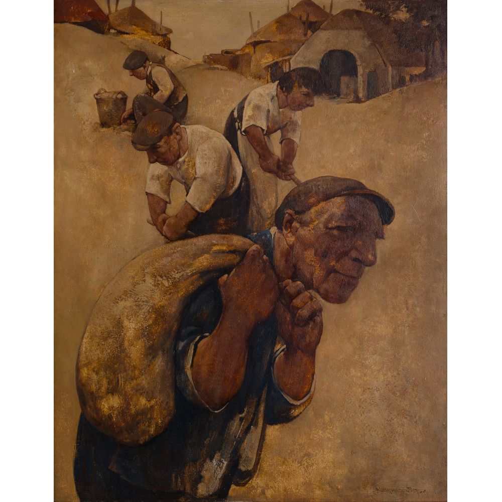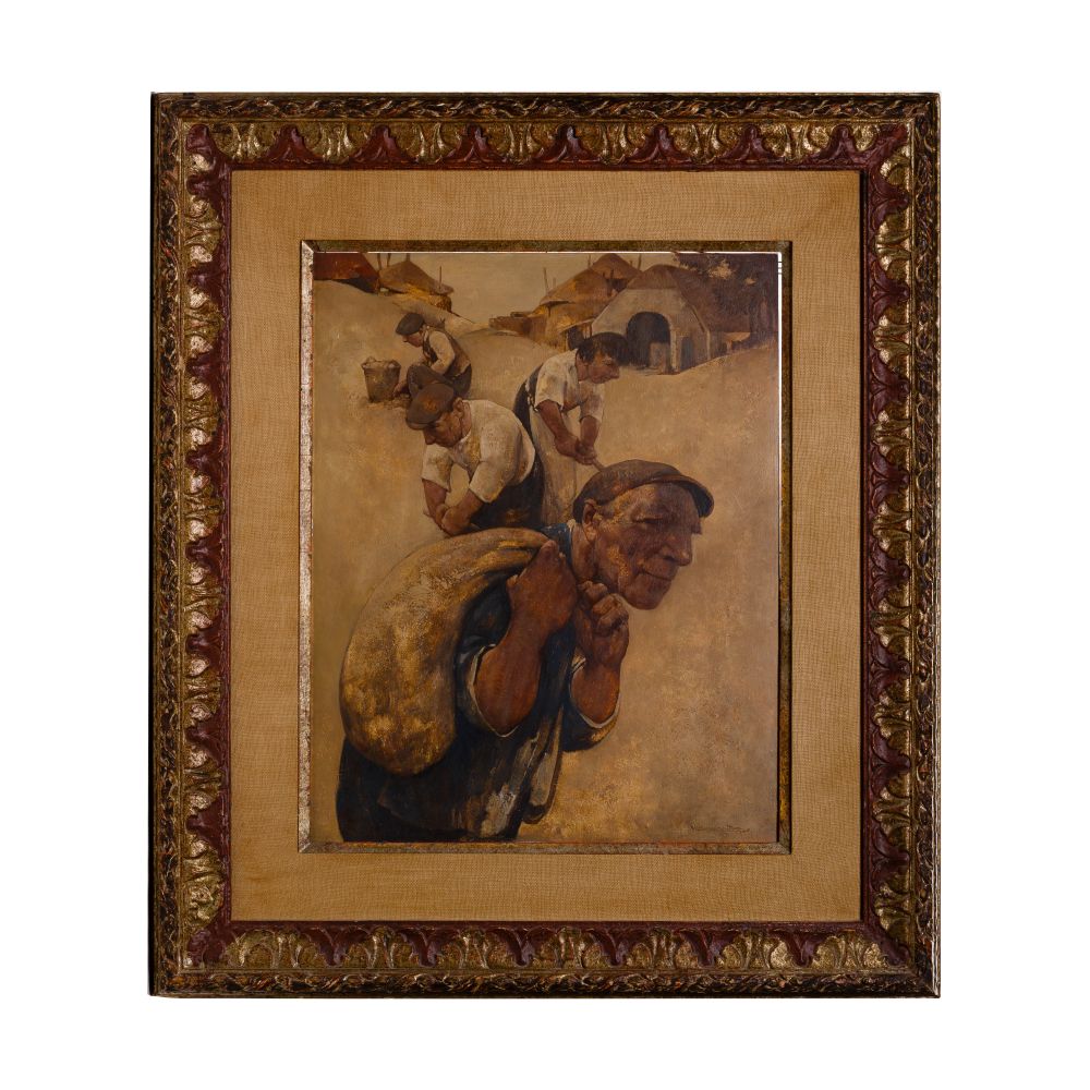 Undated, signed lower right, depiction of agricultural workers, in a linen lined mixed metallic-toned gesso on carved wood frame