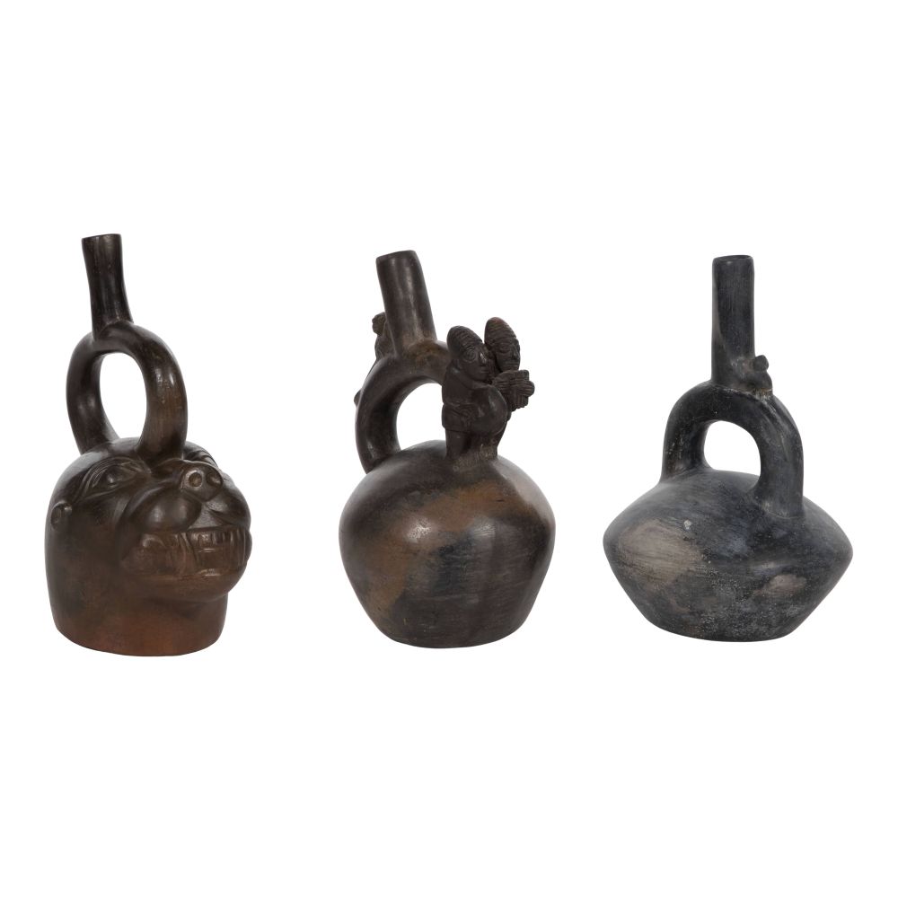 (3) items including a burnished dark brown sea lion effigy from Peru, as well as burnished black ware having small monkeys at vertical spout, including a squat and one having two figures of musicians in front of spout