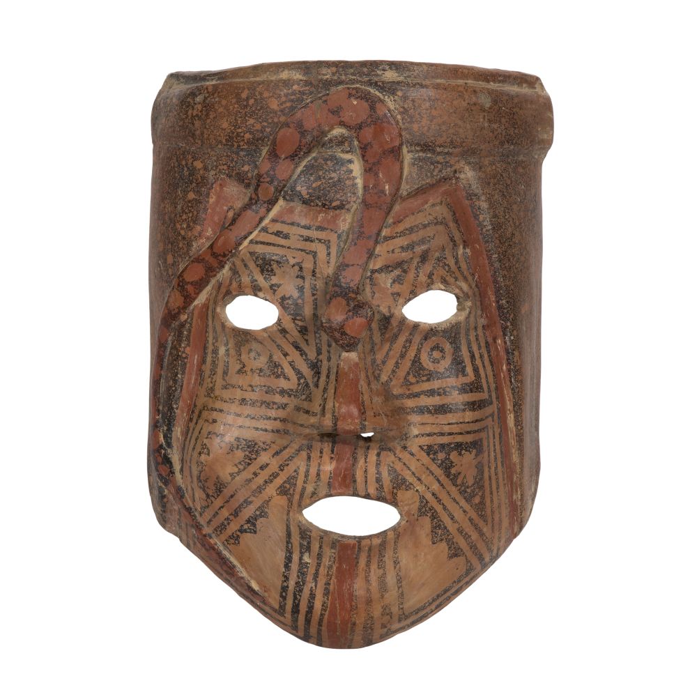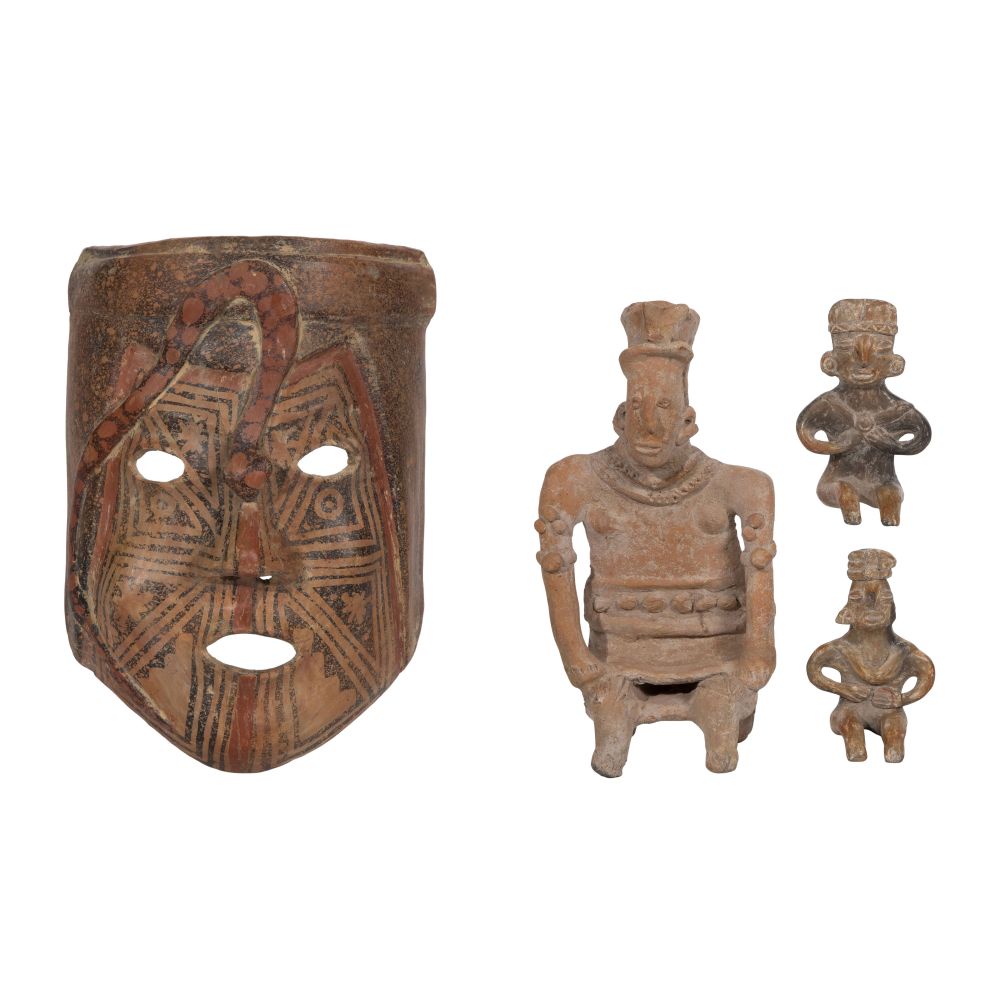 Condition: overall light to moderate wear, mask having a repaired crack from top to bottom, occasional chips, abrasions and losses to paint, Jalisco having a glued-back chip to headdress and chipped ears, the (2) West Mexico both having repaired limbs, overall light to moderate wear, mask having a repaired crack from top to bottom, occasional chips, abrasions and losses to paint, Jalisco having a glued-back chip to headdress and chipped ears, the (2) West Mexico both having repaired limbs