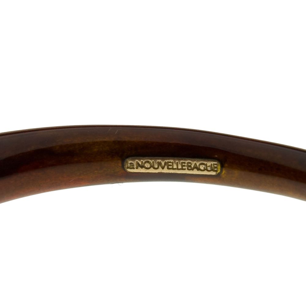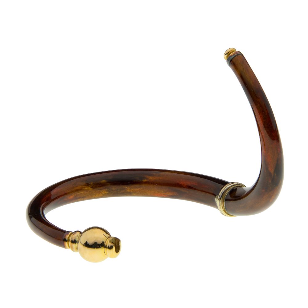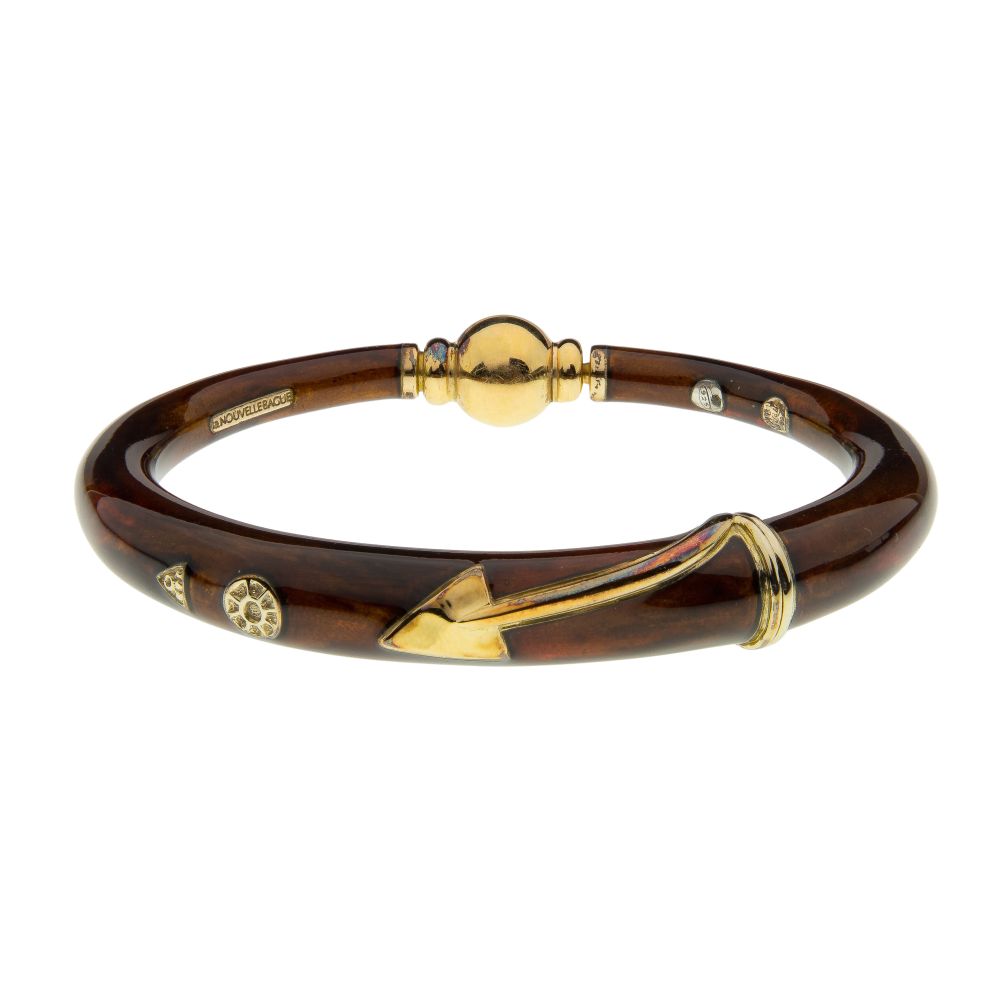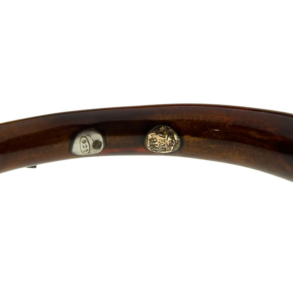 A Metropolitan gold and silver bracelet, tapered, mottled brown enamel having a gold arrow, triangle and sun design (stamped hallmark, “18k” and “925”), storage pouch