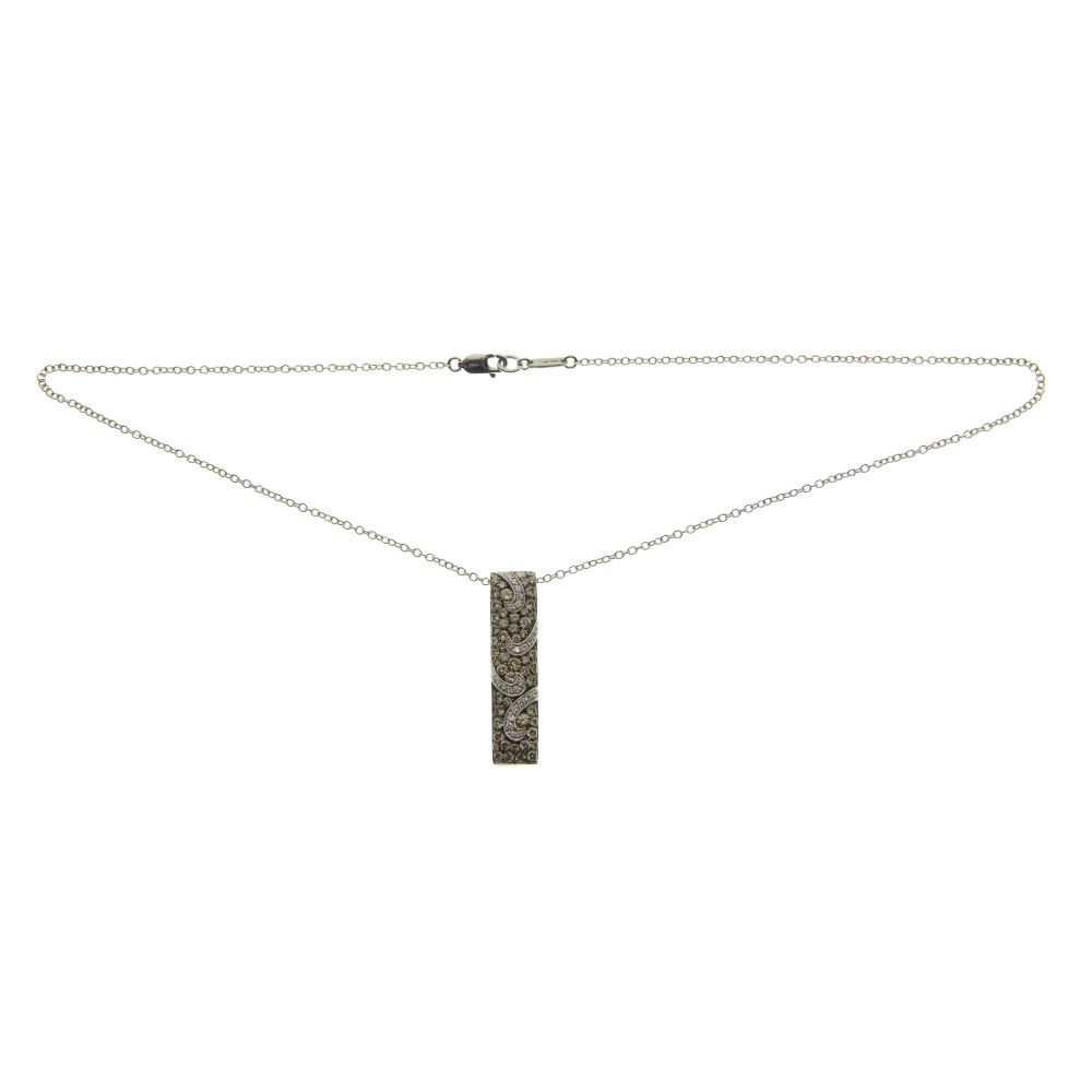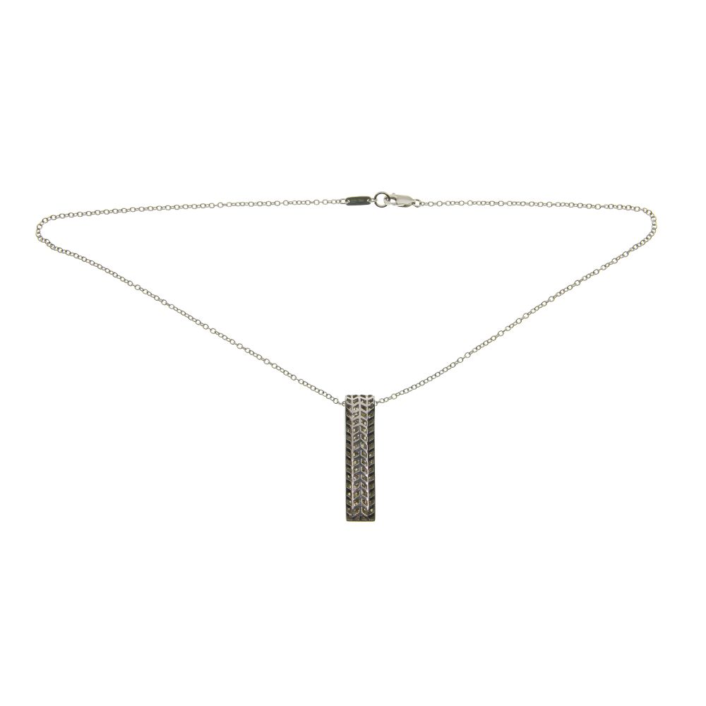A bar slide style pendant having intricate scrolls of round cut diamonds (marked “750” on clasp)