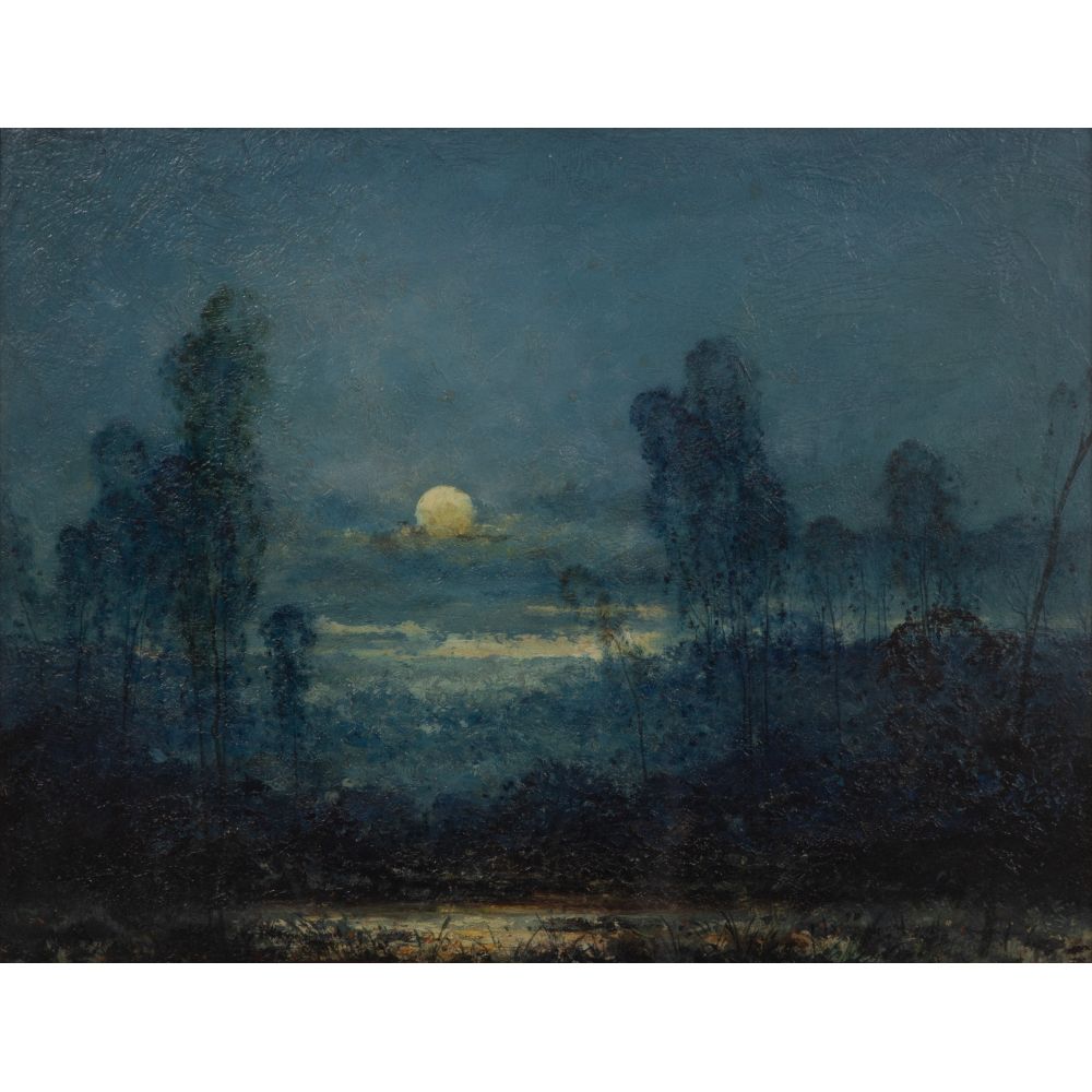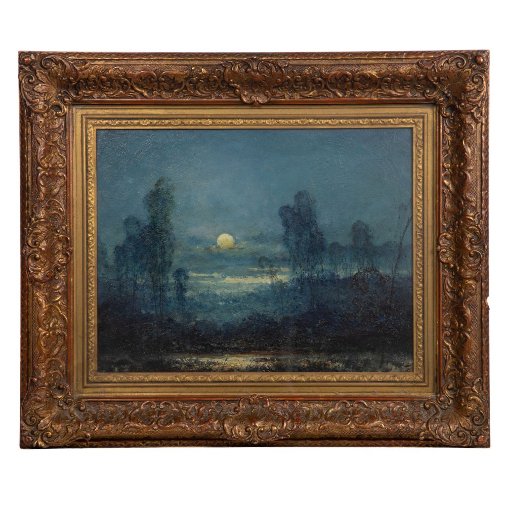 Undated, indistinctly signed, ink signed “Felix” on a partial label verso, depicting a moonlit landscape, behind glass in a bronze-tone gesso on carved wood frame having a label reading “Felix died Oct 28 1962”