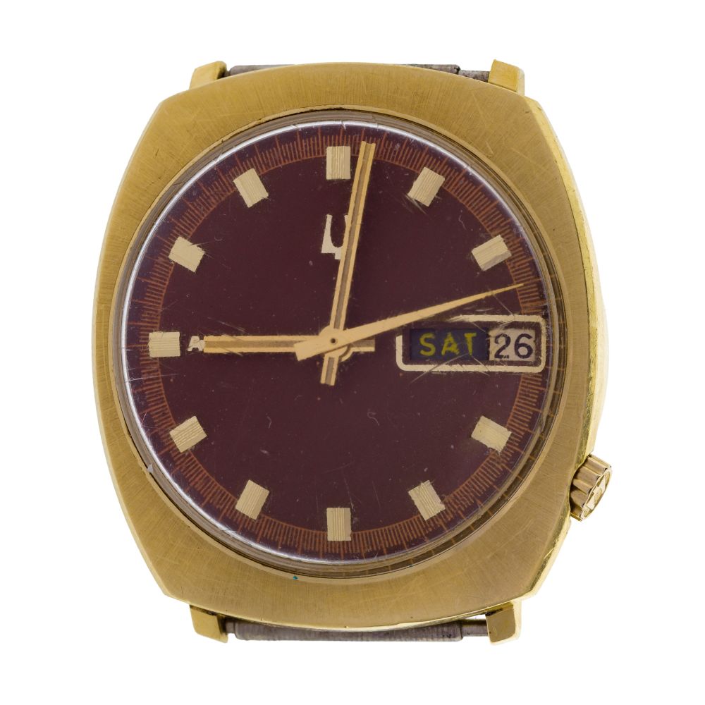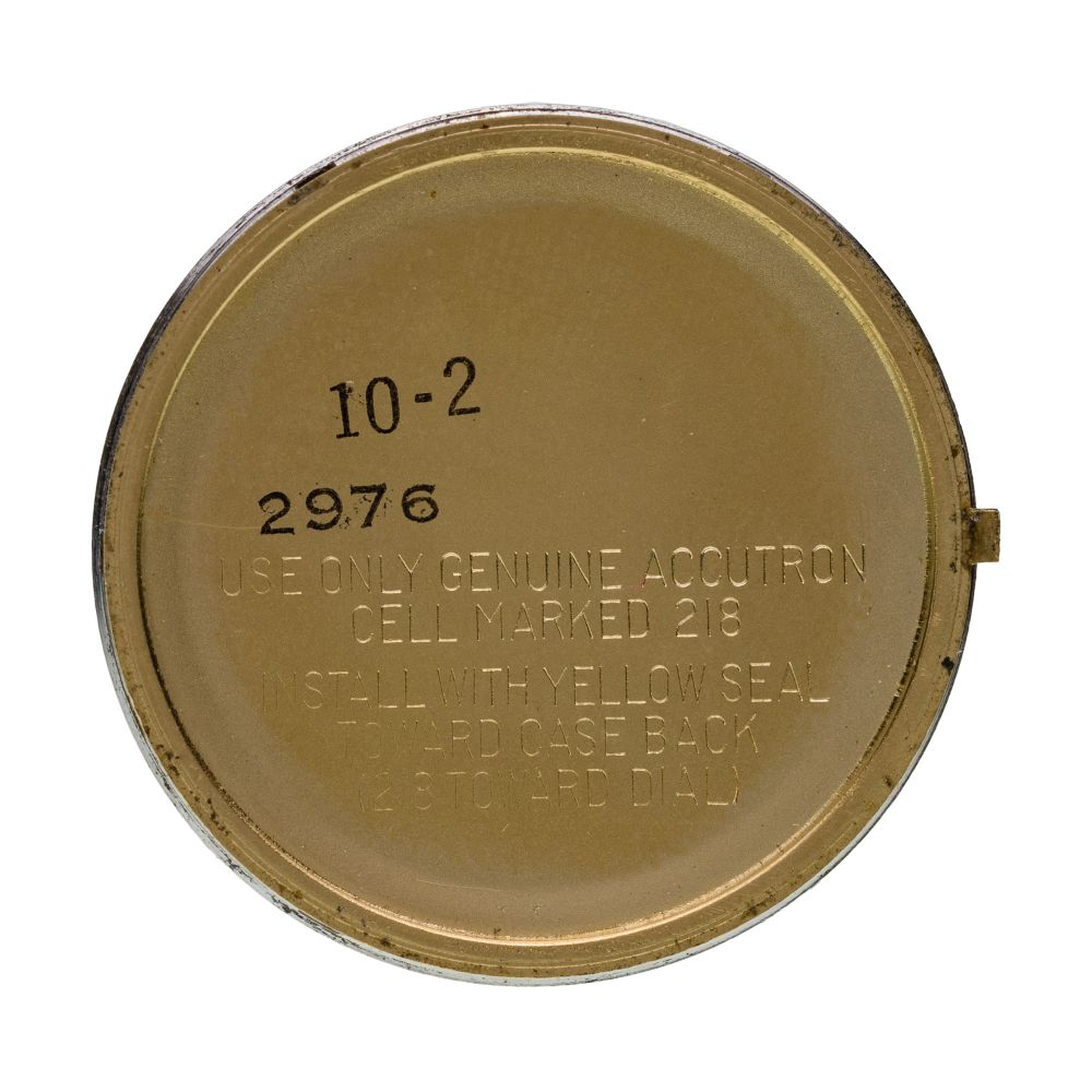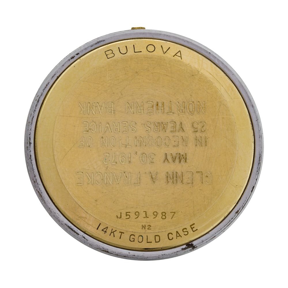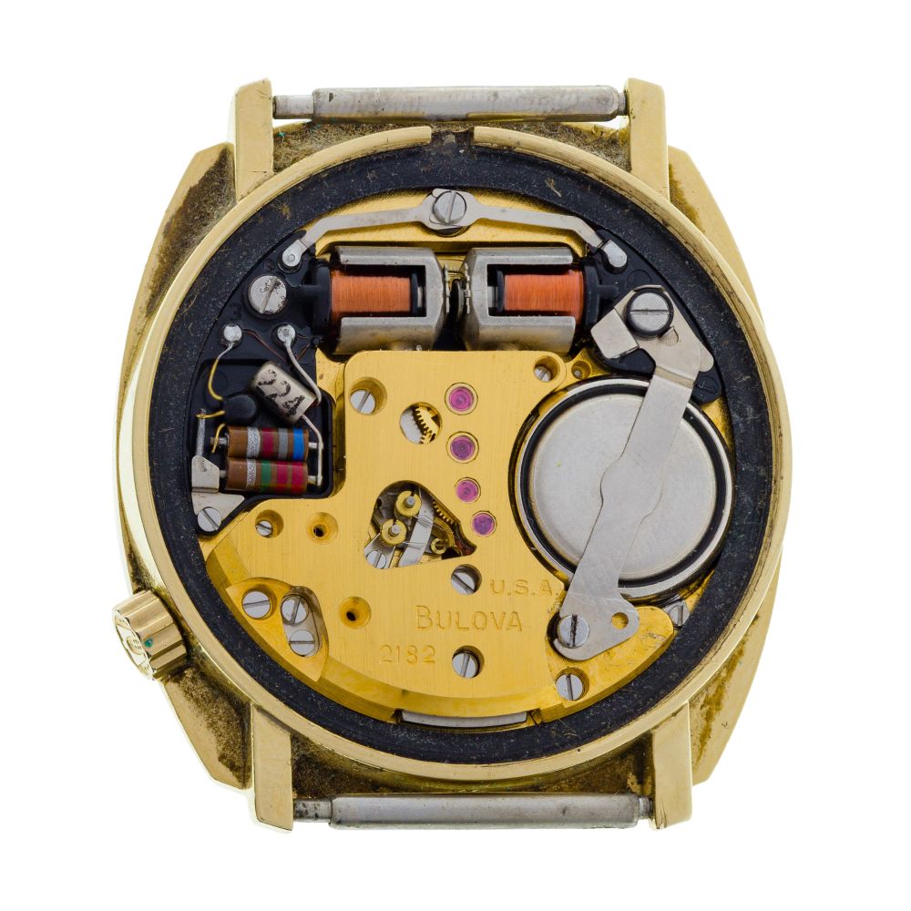 Model #2182, 1970s, applied gold-tone stick hour markers, sweep second hand, date aperture at 3-o’clock, screw-off back (marked “14k”)