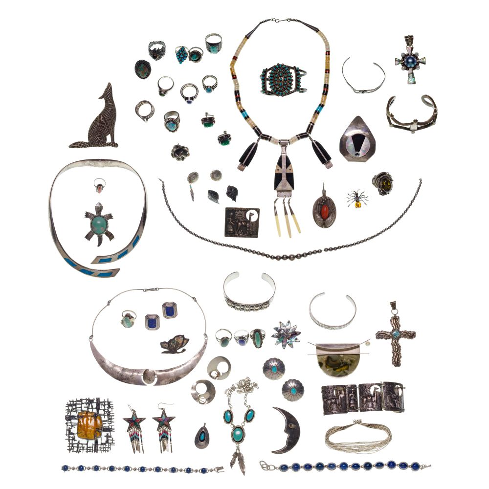 Approximately (2) pounds of necklaces, rings, earrings, bracelets, pins, in various shapes, sizes and designs (most marked “sterling” / “925”); together with pins, a choker necklace, and a ring (unmarked 900)