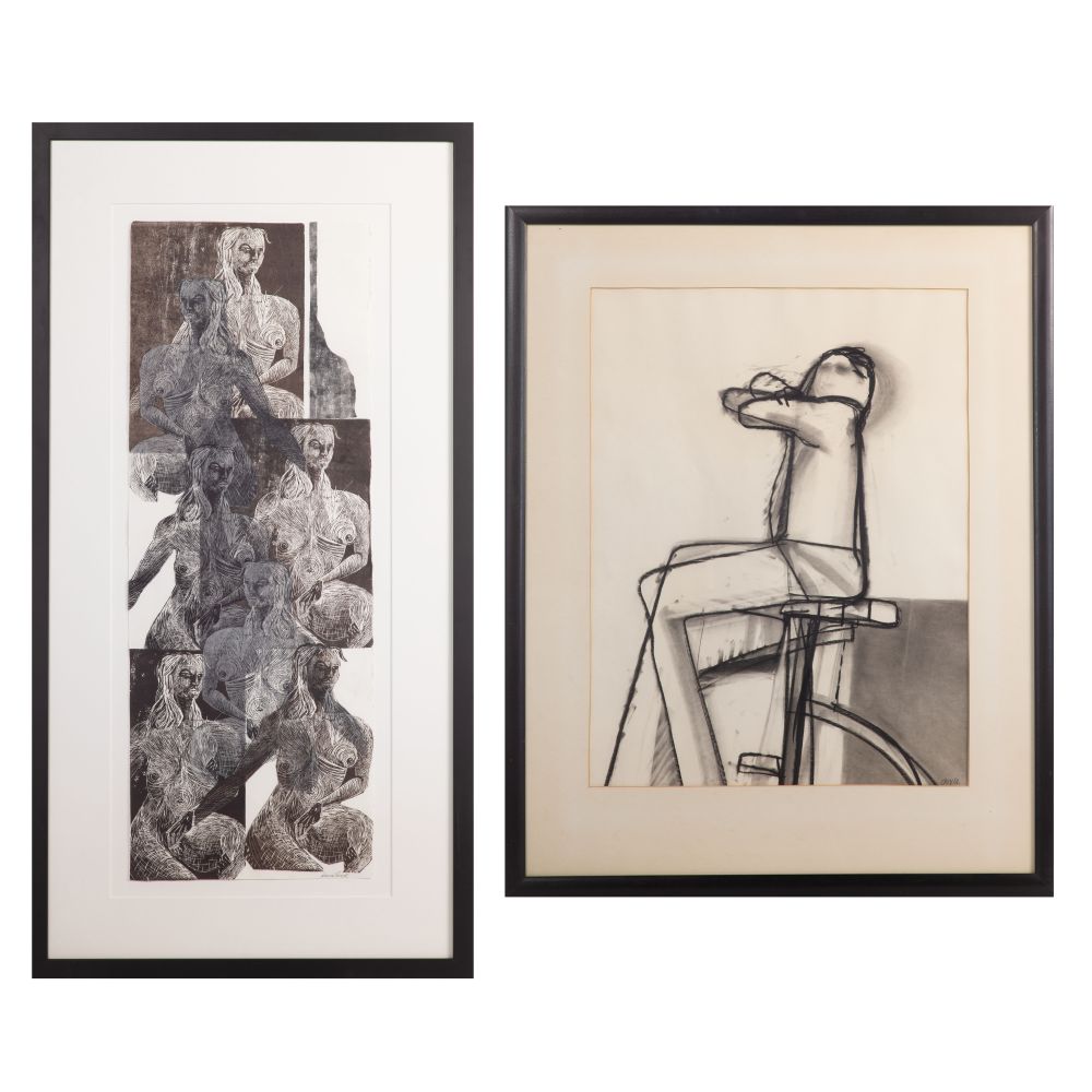 (2) total items including an undated, signed monotype study of form; together with a black and white drawing signed “Doyle”, depicting a seated figure, both matted in black wood frames under acrylic