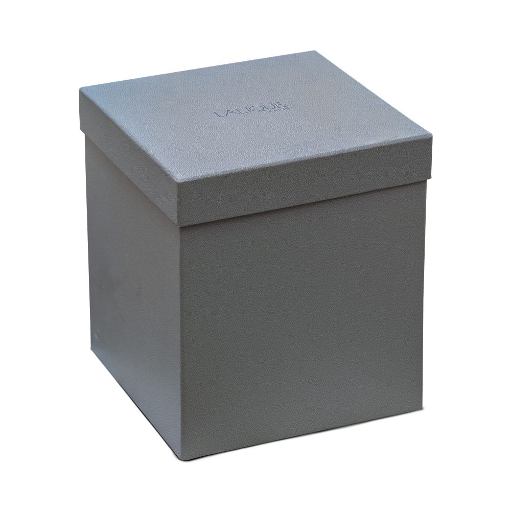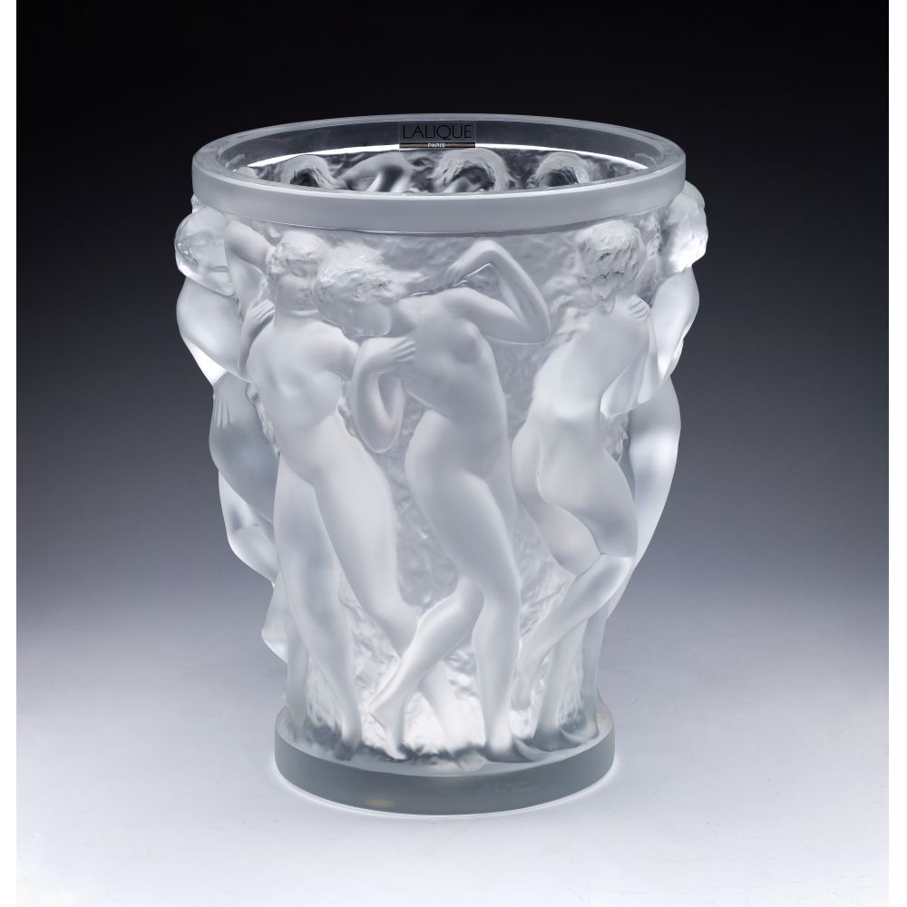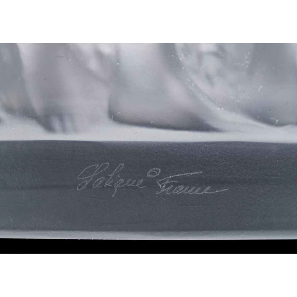 Having a cast continuous relief of dancing nudes, retaining Lalique sticker and printed paper descriptive and care inserts, includes box