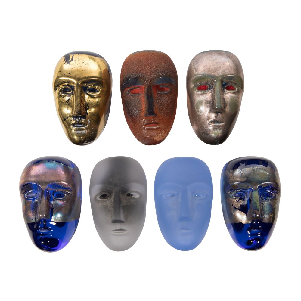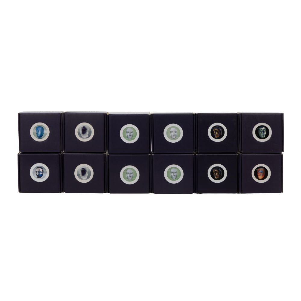 (12) items, depicting human heads of various color glass, including a #1 Karolina, (2) #2 Albert, (2) #3 Florence, a #4 Cesare, (2) #5 John, (2) #6 Midas and (2) Jimenez, all in boxes, most having inserts and fabric bags