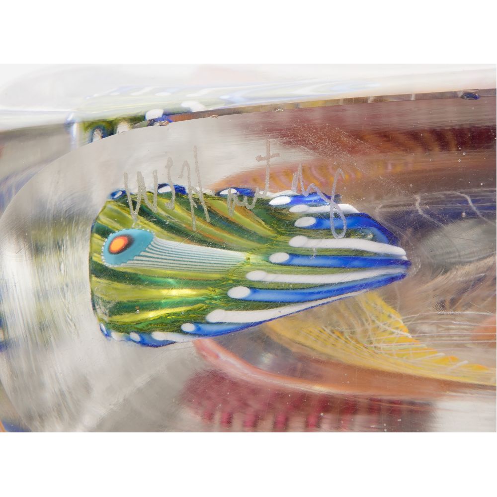 (2) undated items, engraved signatures underside, each having multi-color cane and latticino cased in clear glass organic forms