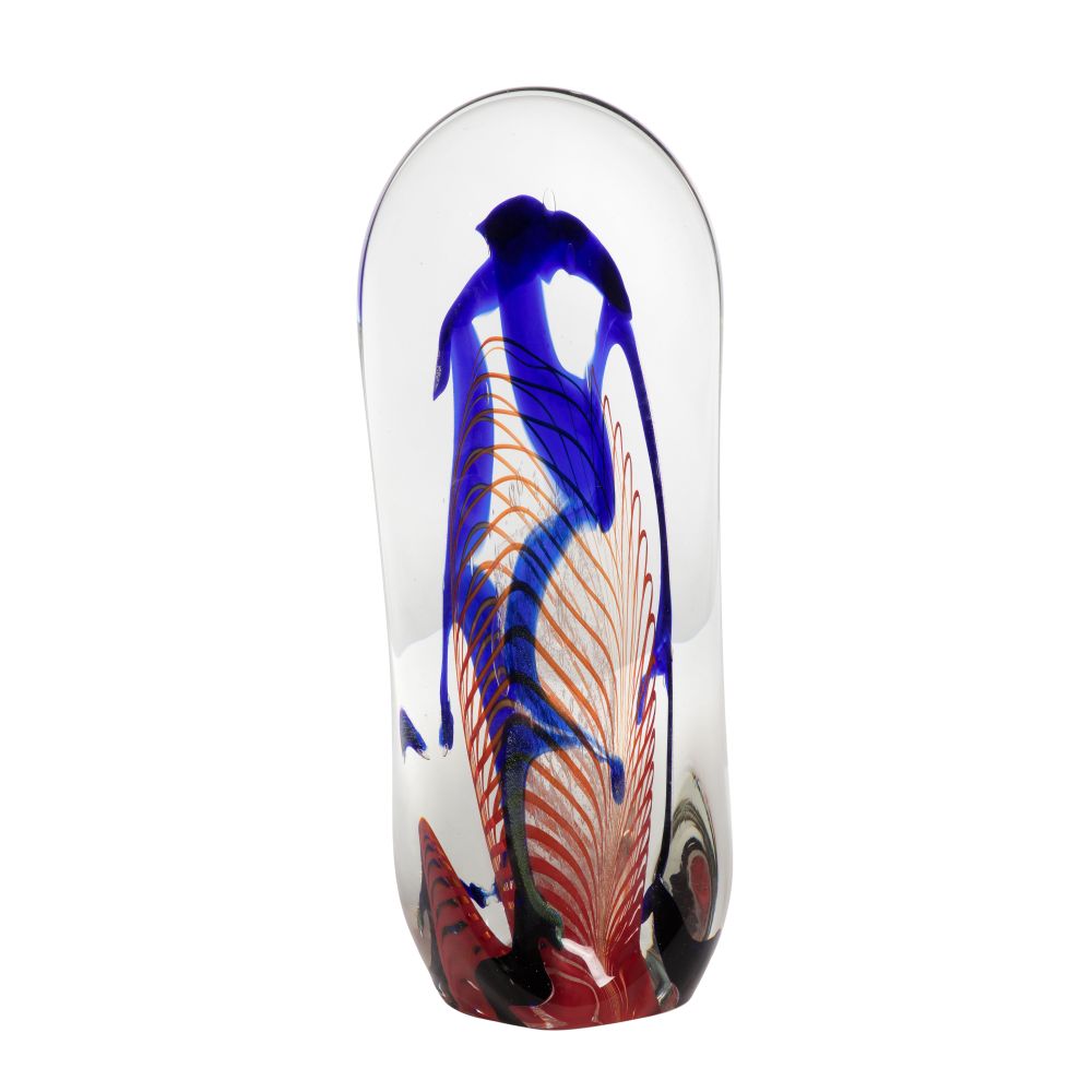 Undated, unsigned, elongated form having red and blue decorative elements encased within colorless glass