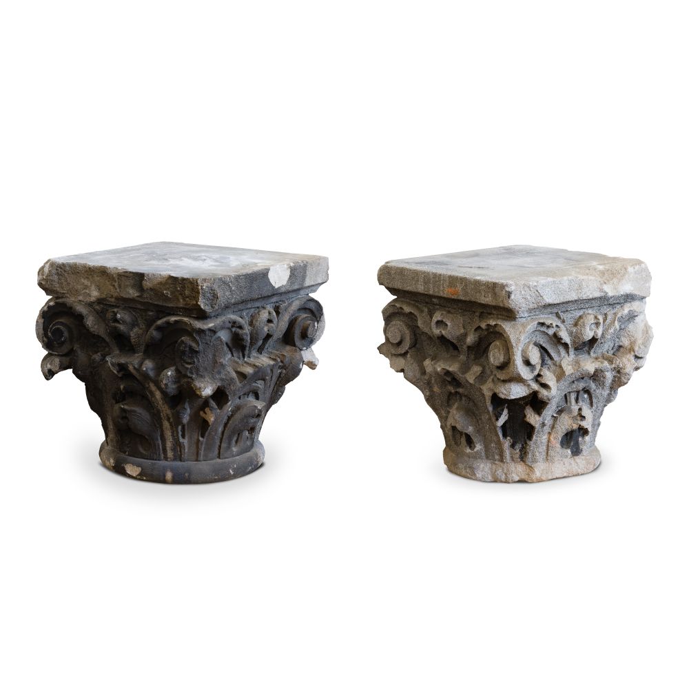 A pair of mixed-order Greek style capitals having Doric volutes over Corinthian foliate decoration