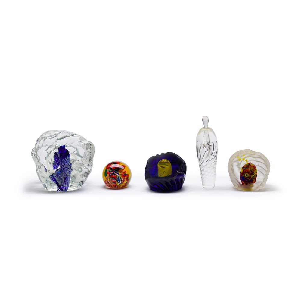 (5) total items, including (3) paperweights and perfume bottle by Rollin Karg; together with a paperweight with illegible signature to the underside
