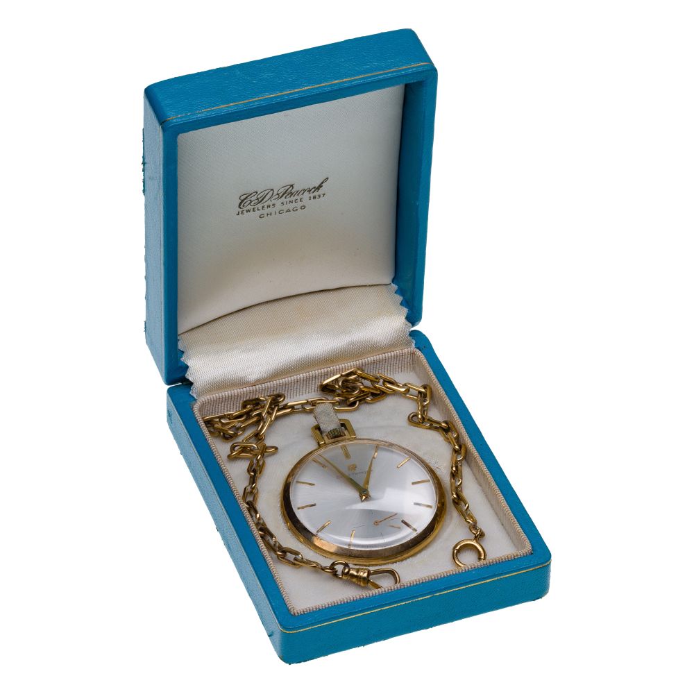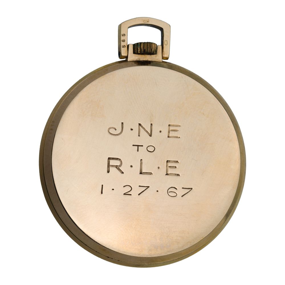 Condition: light wear overall, mild tarnish, scratches, watch back-plate having monogram dedication, box showing signs of storage wear, running when tested, light wear overall, mild tarnish, scratches, watch back-plate having monogram dedication, box showing signs of storage wear, running when tested