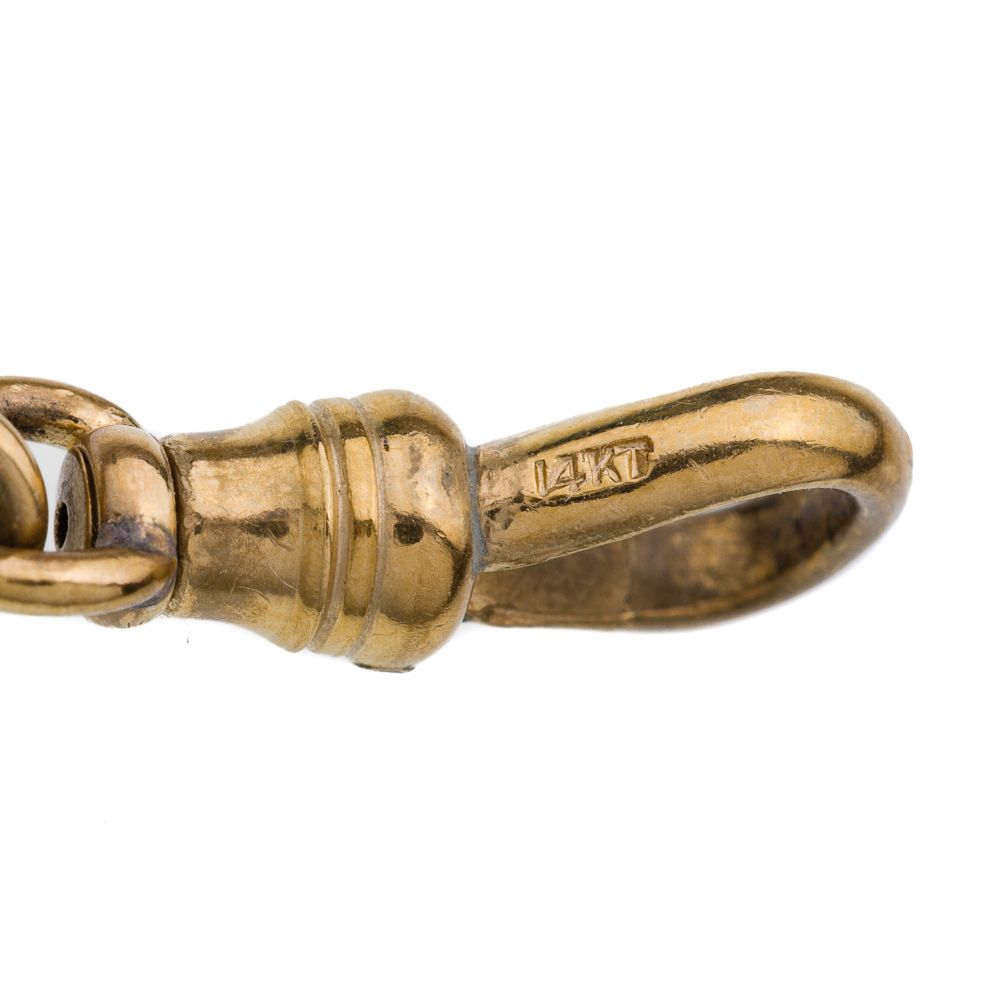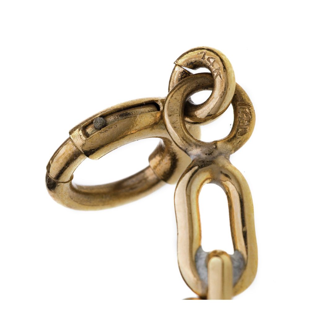 Having a stick indices dial, a circular bezel, a square link chain and C.D. Peacock presentation box (watch marked “585” on bow, chain marked “14k” in three places)