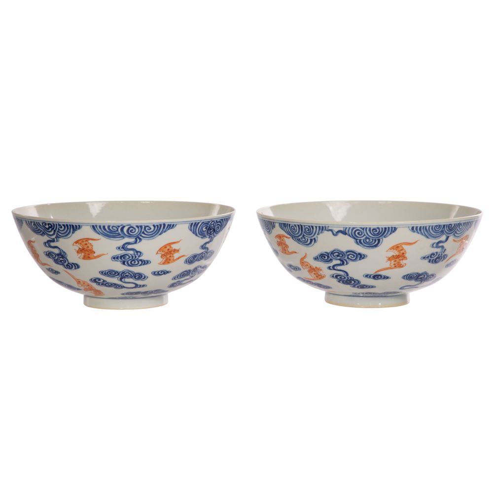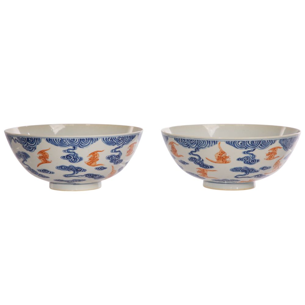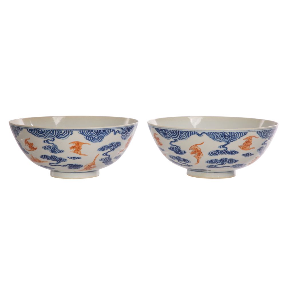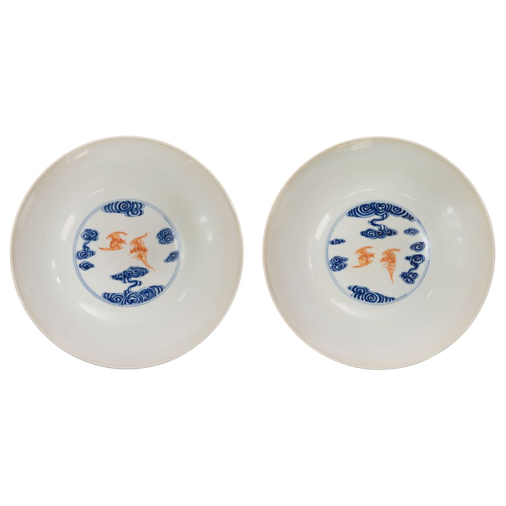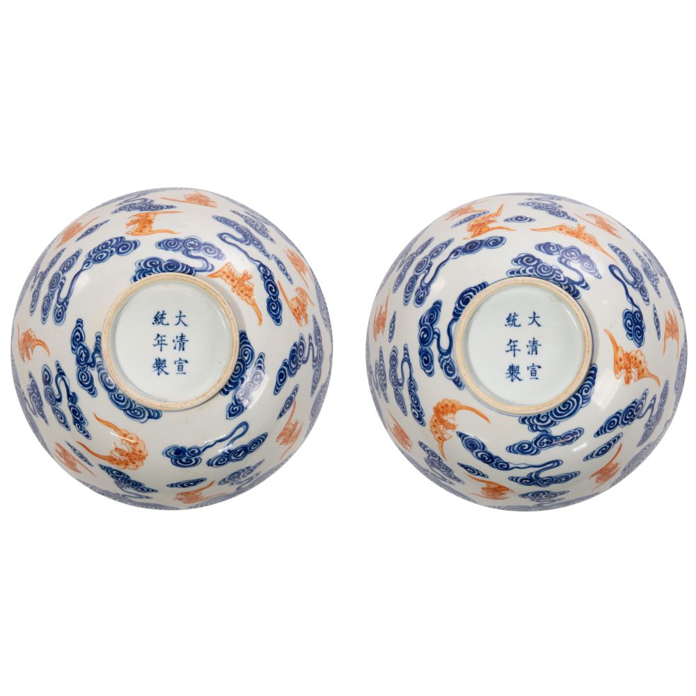 A pair having iron red enamel bats amid underglaze blue cloud decoration, both having underglaze blue 6-character Xuantong marks underside
