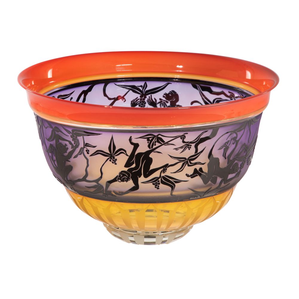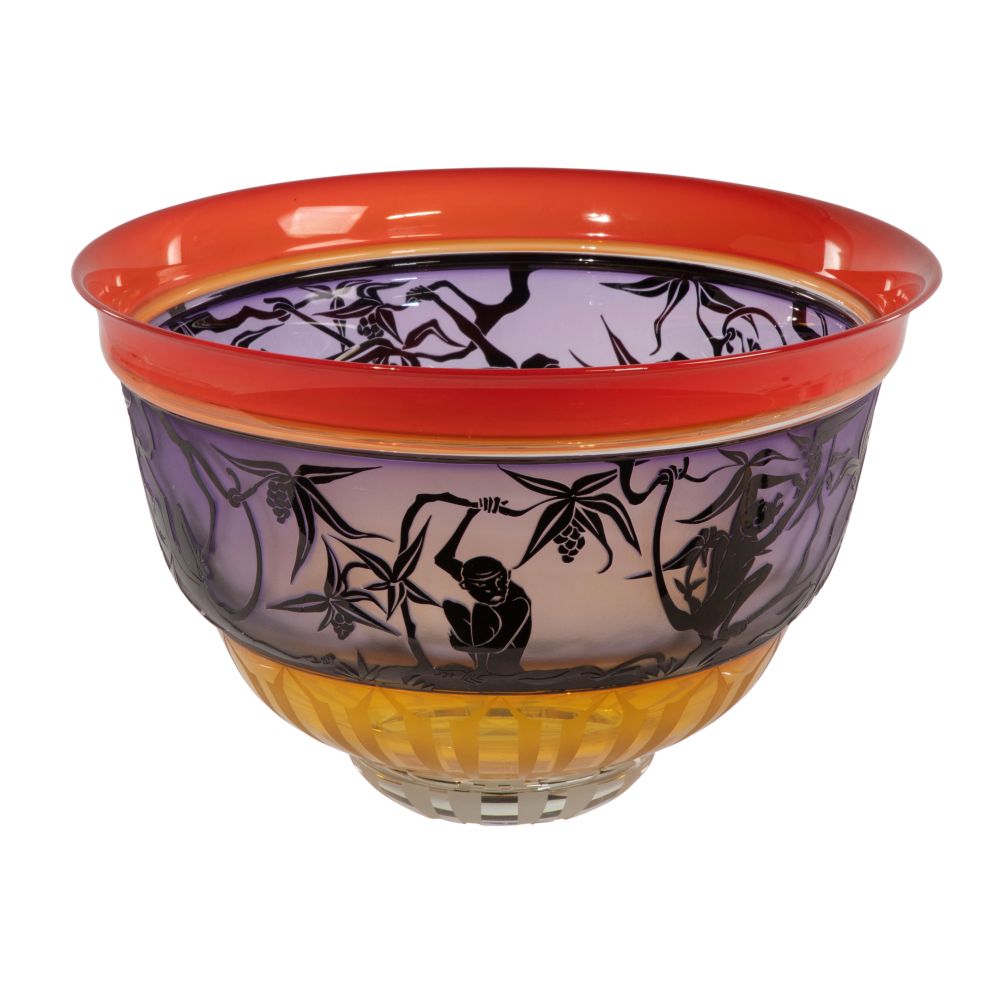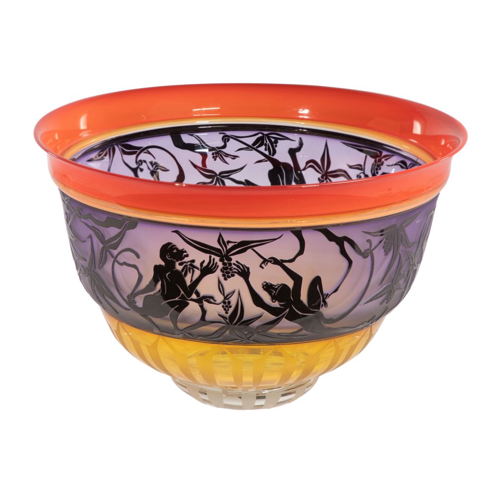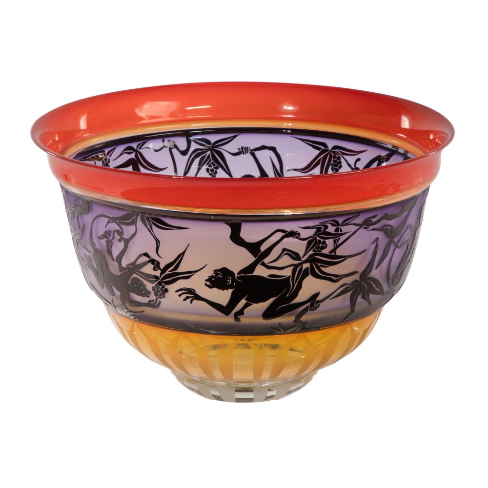 1997, engraved signature and date to side, having etched and sandblasted band of black monkeys and foliage on frosted pale aubergine below an everted orange rim and resting on a transparent yellow transitioning to colorless foot having etched geometric decoration, accompanied by illustrated invoice and ephemera