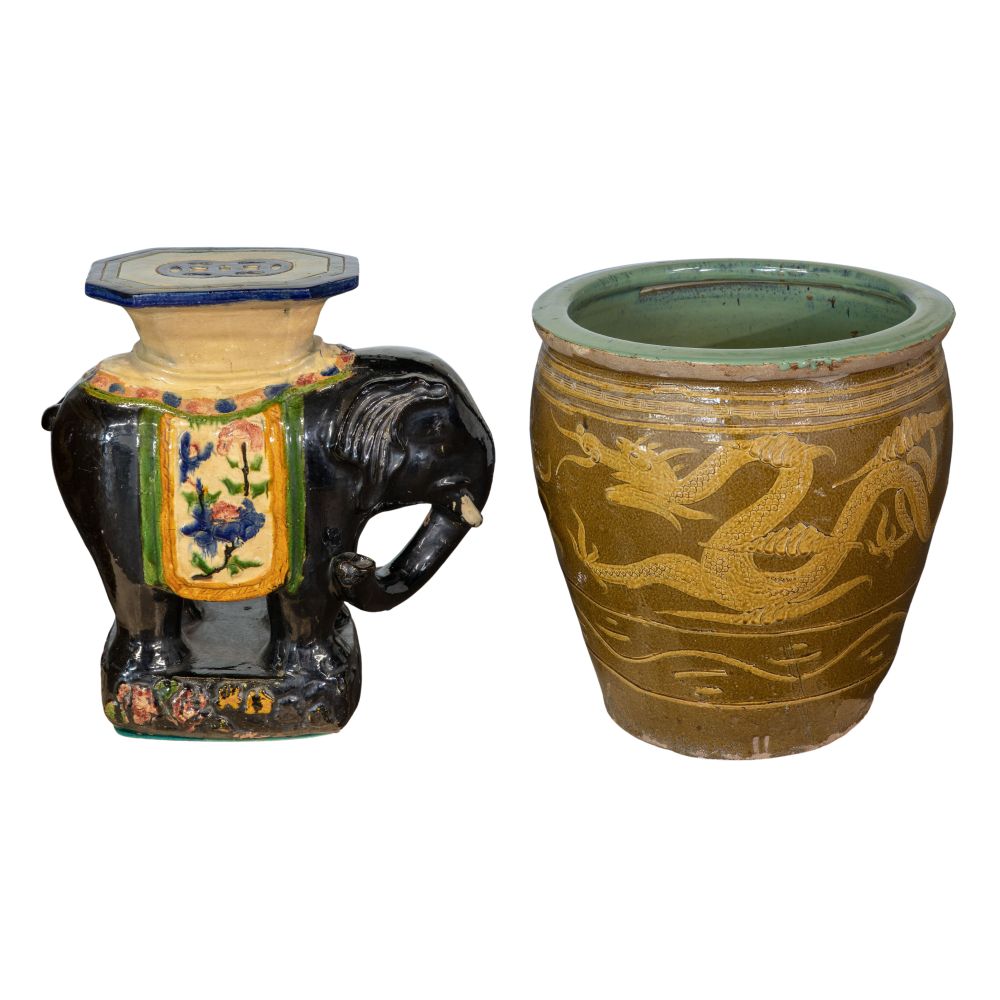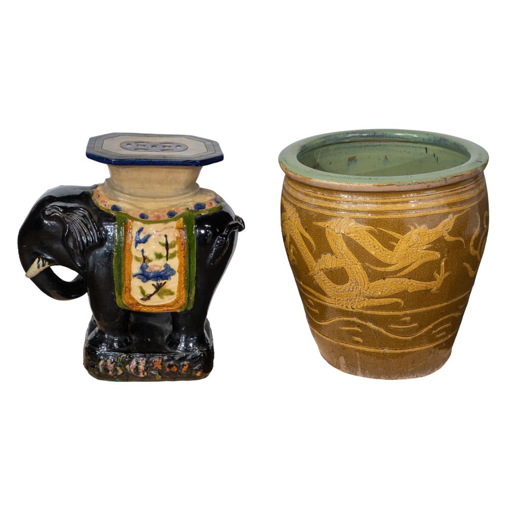 Chinese Elephant Garden Stool and Dragon Jardiniere