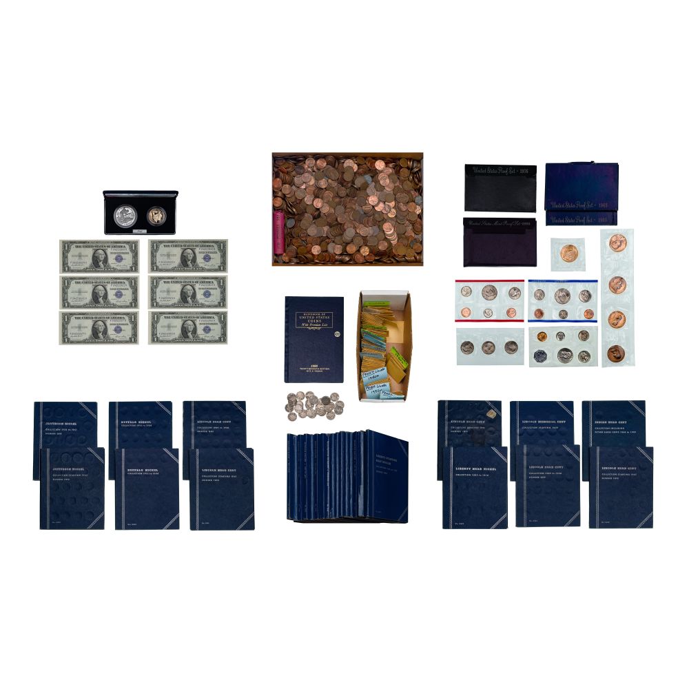 Including a 1957 mint set, (2) 1968 proof sets, a 1976 proof set, a 1993 proof and (2) mint sets, (12) partial coin set albums, a 1979 Susan B. Anthony type set, approximately (23) pounds of Lincoln Wheat and Memorial 1c, assorted Buffalo and Jefferson 5c, (6) 1935-E silver certificates, a World War II anniversary coin set, (4) presidential bronze commemorative, a John Wayne commemorative and (17) empty Whitman coin folders